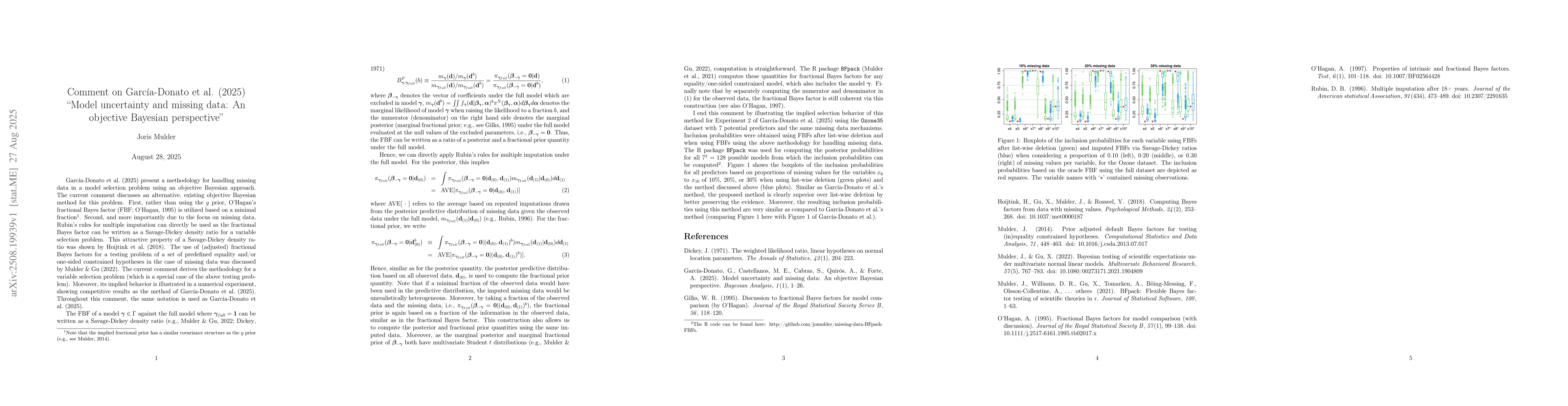 Garcia-Donato et al. (2025) present a methodology for handling missing data in a model selection problem using an objective Bayesian approach. The current comment discusses an alternative, existing objective Bayesian method for this problem. First, rather than using the g prior, O'Hagan's fractional Bayes factor (O'Hagan, 1995) is utilized based on a minimal fraction. Second, and more importantly due to the focus on missing data, Rubin's rules for multiple imputation can directly be used as the fractional Bayes factor can be written as a Savage-Dickey density ratio for a variable selection problem. The current comment derives the methodology for a variable selection problem. Moreover, its implied behavior is illustrated in a numerical experiment, showing competitive results as the method of Garcia-Donato et al. (2025).