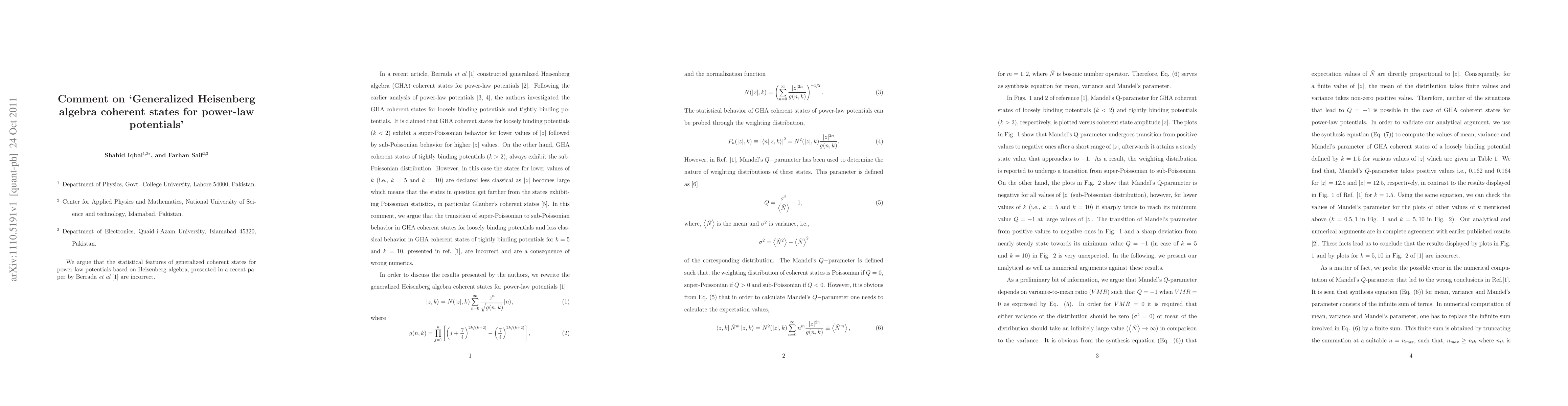 Summary: This paper critiques the statistical features of generalized coherent states for power-law potentials based on Heisenberg algebra, asserting that the results presented by Berrada et al. (Phys. Lett. A, 375, 298 (2011)) are flawed. The author proposes a correction to these findings.