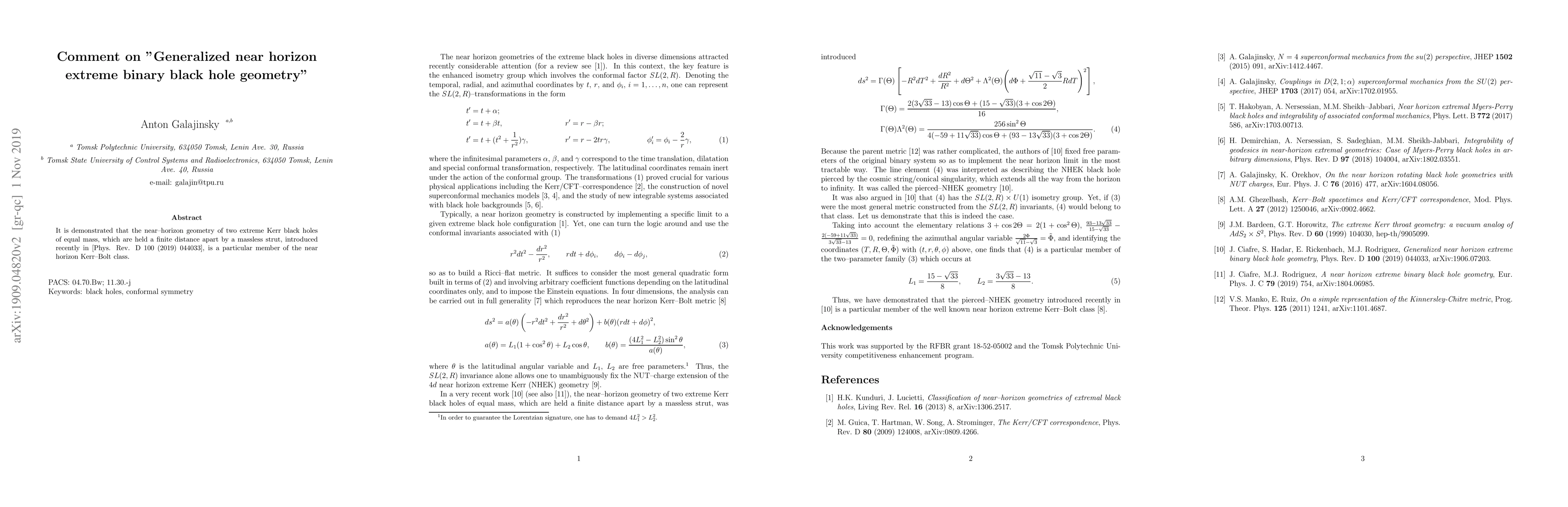 It is demonstrated that the near-horizon geometry of two extreme Kerr black holes of equal mass, which are held a finite distance apart by a massless strut, introduced recently in [Phys. Rev. D 100 (2019) 044033], is a particular member of the near horizon Kerr-Bolt class.