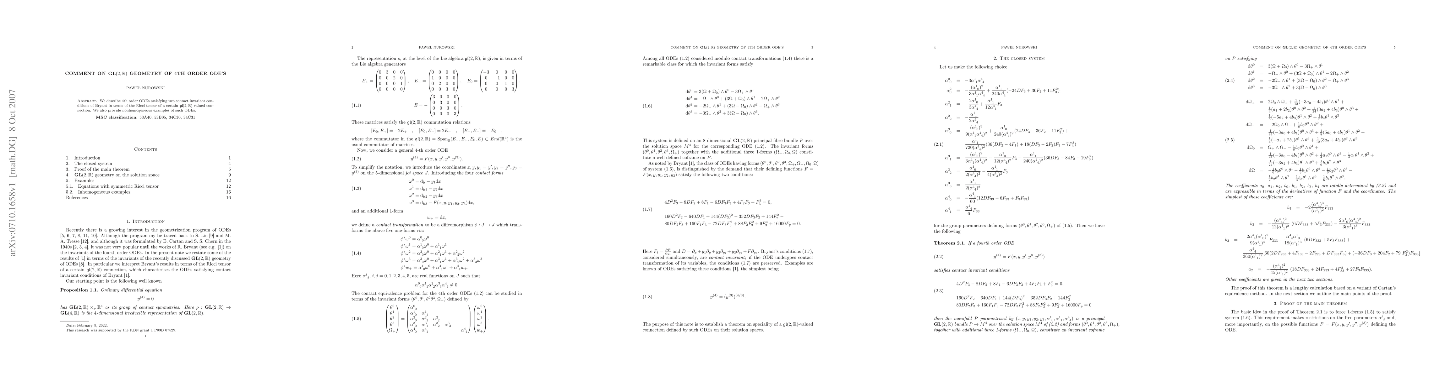This paper discusses 4th order ordinary differential equations (ODEs) under two contact invariant conditions proposed by Bryant, expressing them in terms of the Ricci tensor of a gl(2,R) valued connection. It also presents nonhomogeneous examples of these ODEs.