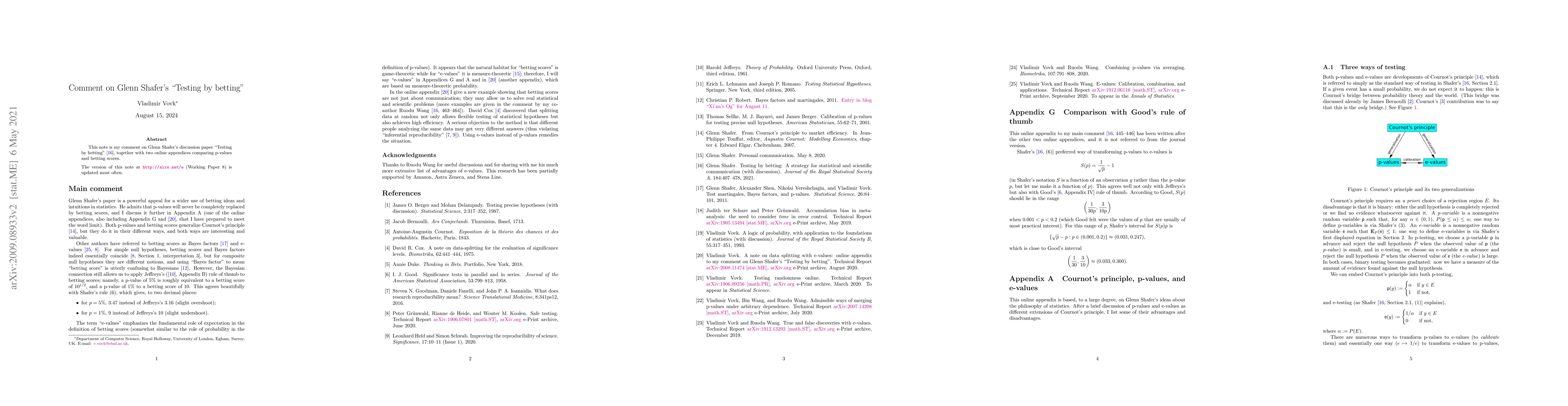 This paper comments on Glenn Shafer's discussion paper 'Testing by betting', comparing p-values to betting scores, with implications for hypothesis testing and statistical inference.
