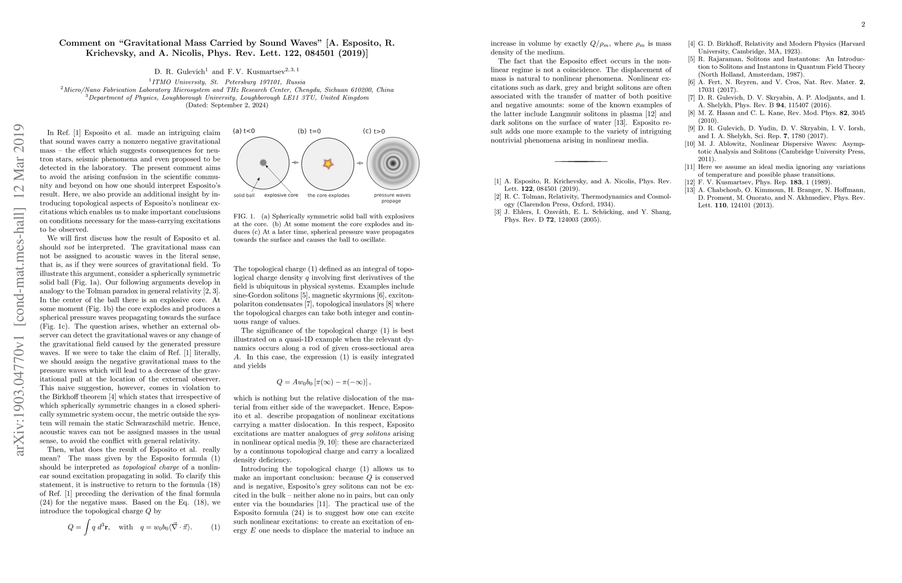 We comment on the paper A. Esposito, R. Krichevsky, and A. Nicolis, "Gravitational Mass Carried by Sound Waves", Phys. Rev. Lett. 122, 084501 (2019). Our comment aims to avoid the confusion arisen in the scientific community and beyond on how the result of Esposito et al. should be interpreted.