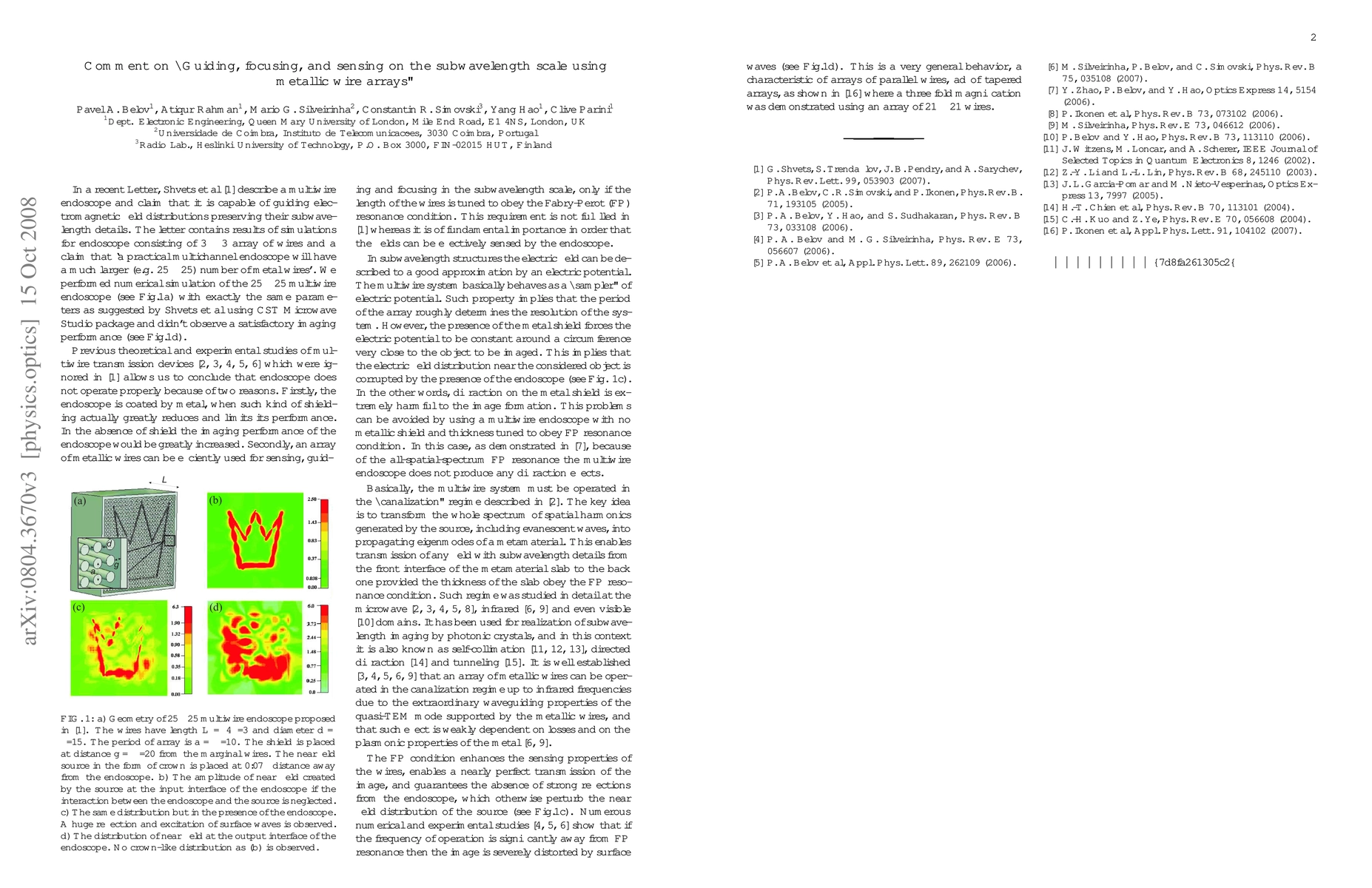 This comment critiques the subwavelength imaging capabilities of metallic wire arrays proposed in a previous study, arguing that the endoscope does not achieve satisfactory resolution for subwavelength imaging.
