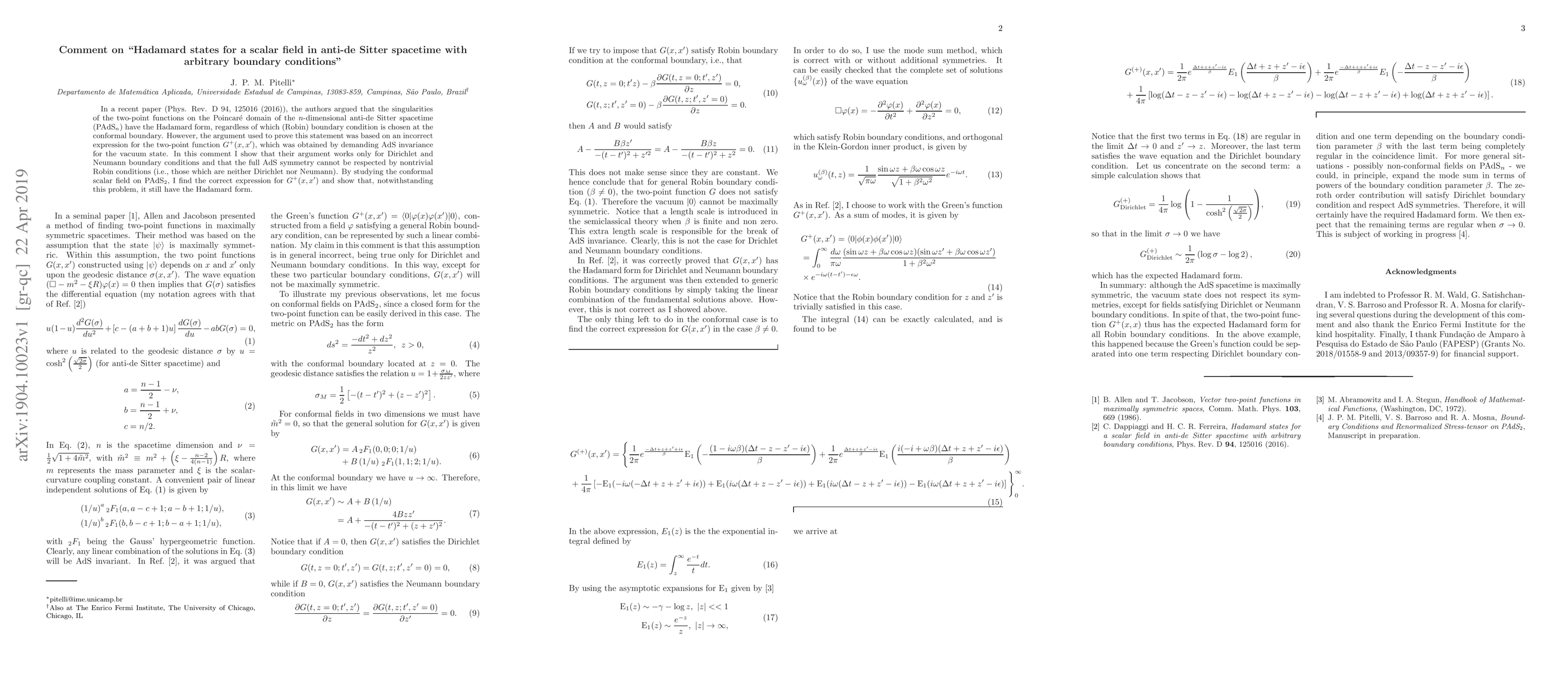 In a recent paper (Phys. Rev. D 94, 125016 (2016)), the authors argued that the singularities of the two-point functions on the Poincar\'e domain of the $n$-dimensional anti-de Sitter spacetime ($\text{PAdS}_n$) have the Hadamard form, regardless of which (Robin) boundary condition is chosen at the conformal boundary. However, the argument used to prove this statement was based on an incorrect expression for the two-point function $G^{+}(x,x')$, which was obtained by demanding $\text{AdS}$ invariance for the vacuum state. In this comment I show that their argument works only for Dirichlet and Neumann boundary conditions and that the full $\text{AdS}$ symmetry cannot be respected by nontrivial Robin conditions (i.e., those which are neither Dirichlet nor Neumann). By studying the conformal scalar field on $\text{PAdS}_2$, I find the correct expression for $G^{+}(x,x')$ and show that, notwithstanding this problem, it still have the Hadamard form.