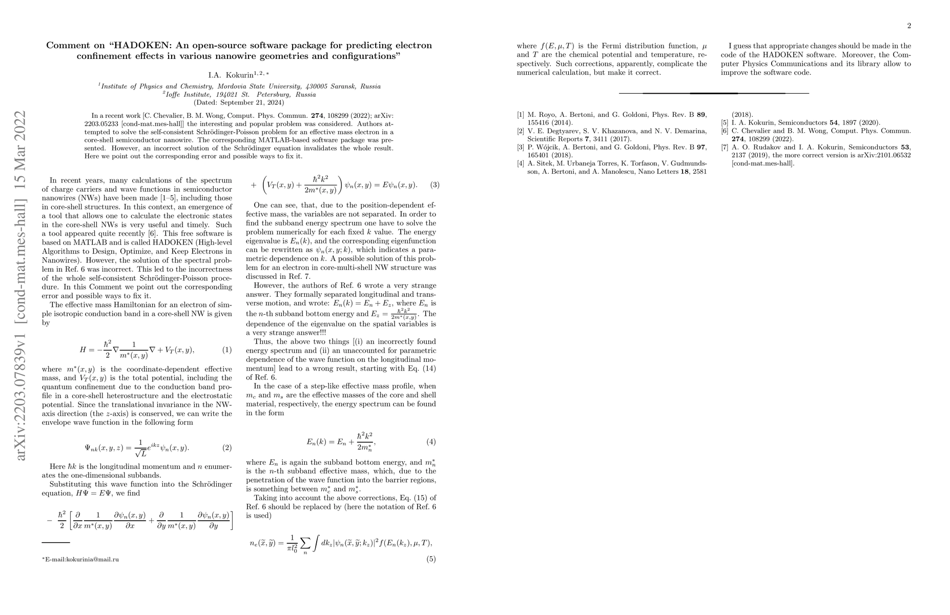 This paper critiques the HADOKEN software package for predicting electron confinement in nanowires, highlighting a critical error in the Schrödinger equation solution. The authors propose corrections to ensure accurate predictions.