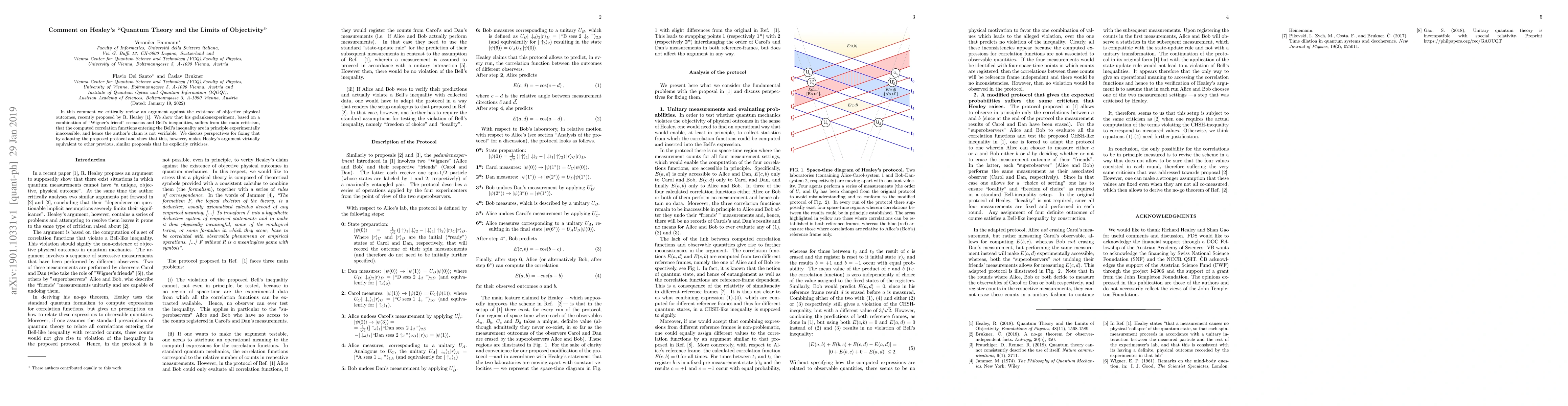 In this comment we critically review an argument against the existence of objective physical outcomes, recently proposed by R. Healey [Foundations of Physics, 48(11), 1568-1589]. We show that his gedankenexperiment, based on a combination of "Wigner's friend" scenarios and Bell's inequalities, suffers from the main criticism, that the computed correlation functions entering the Bell's inequality are in principle experimentally inaccessible, and hence the author's claim is not verifiable. We discuss perspectives for fixing that by adapting the proposed protocol and show that this, however, makes Healey's argument virtually equivalent to other previous, similar proposals that he explicitly criticises.