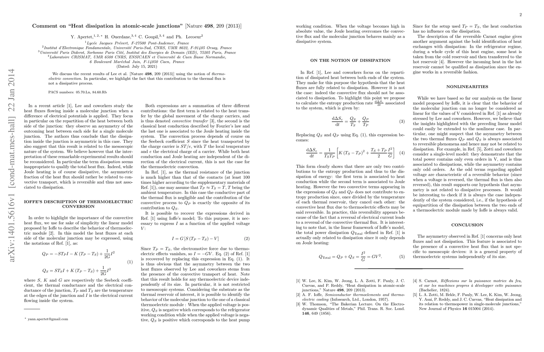 We discuss the recent results of Lee et al. [Nature 498, 209 (2013)] using the notion of thermoelectric convection. In particular, we highlight the fact that this contribution to the thermal flux is not a dissipative process.