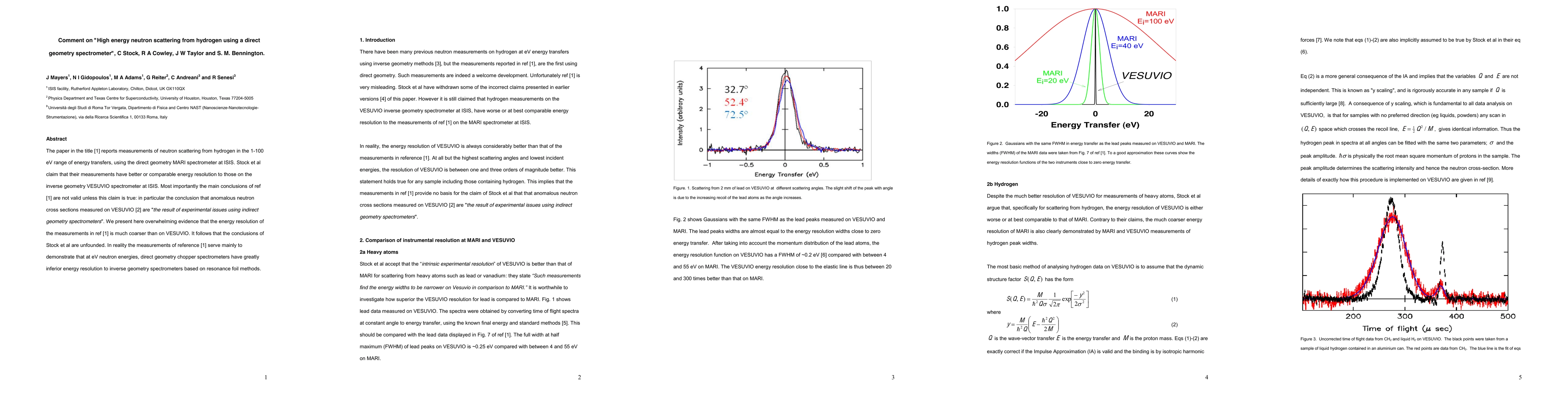 The paper in the title [1] reports measurements of neutron scattering from hydrogen in the 1-100 eV range of energy transfers, using the direct geometry MARI spectrometer at ISIS. Stock et al claim that their measurements have better or comparable energy resolution to those on the inverse geometry VESUVIO spectrometer at ISIS. Most importantly the main conclusions of ref [1] are not valid unless this claim is true: in particular the conclusion that anomalous neutron cross sections measured on VESUVIO [2] are "the result of experimental issues using indirect geometry spectrometers". We present here overwhelming evidence that the energy resolution of the measurements in ref [1] is much coarser than on VESUVIO. It follows that the conclusions of Stock et al are unfounded. In reality the measurements of reference [1] serve mainly to demonstrate that at eV neutron energies, direct geometry chopper spectrometers have greatly inferior energy resolution to inverse geometry spectrometers based on resonance foil methods.