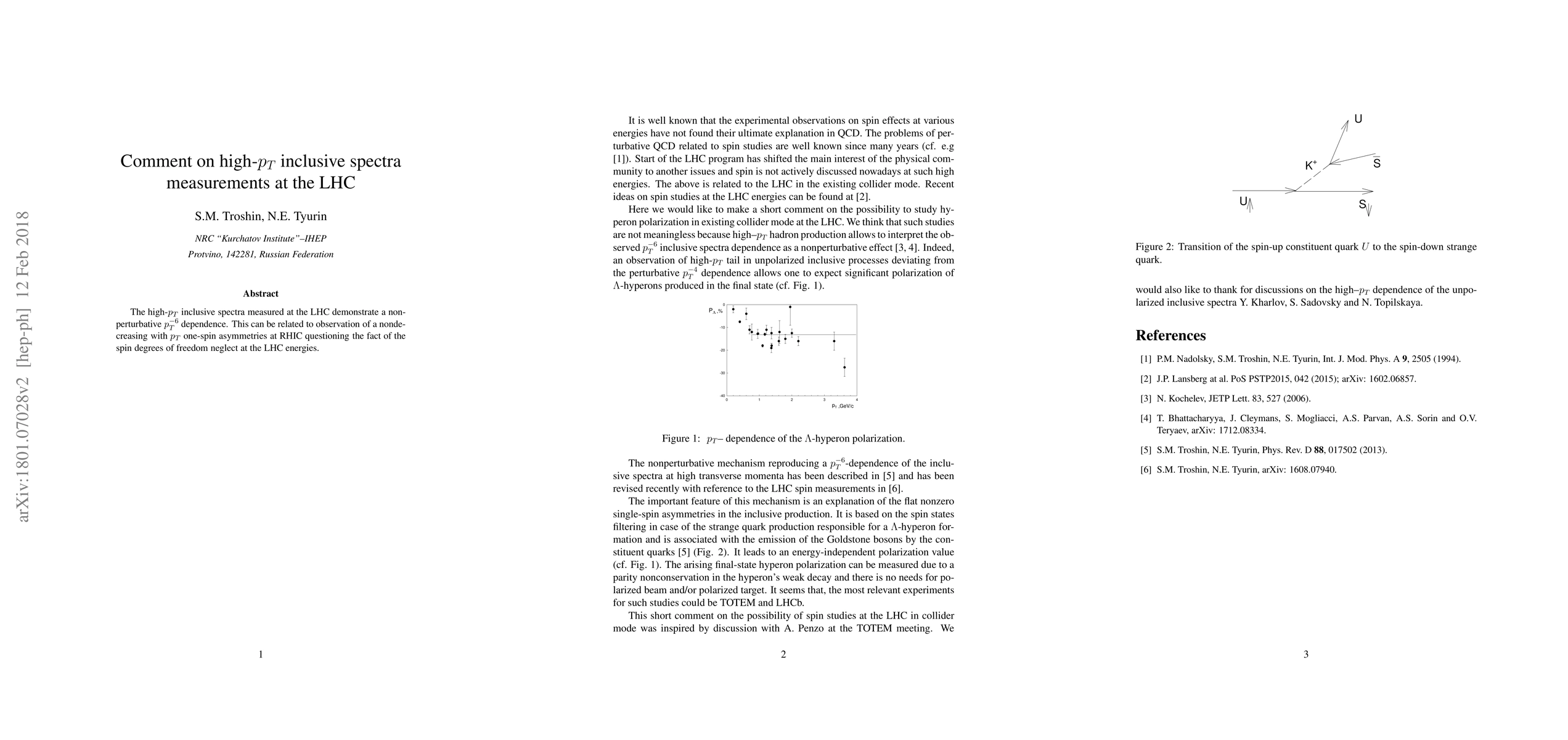 The high-$p_T$ inclusive spectra measured at the LHC demonstrate a non-perturbative $p_T^{-6}$ dependence. This can be related to observation of a nondecreasing with $p_T$ one-spin asymmetries at RHIC questioning the fact of the spin degrees of freedom neglect at the LHC energies.