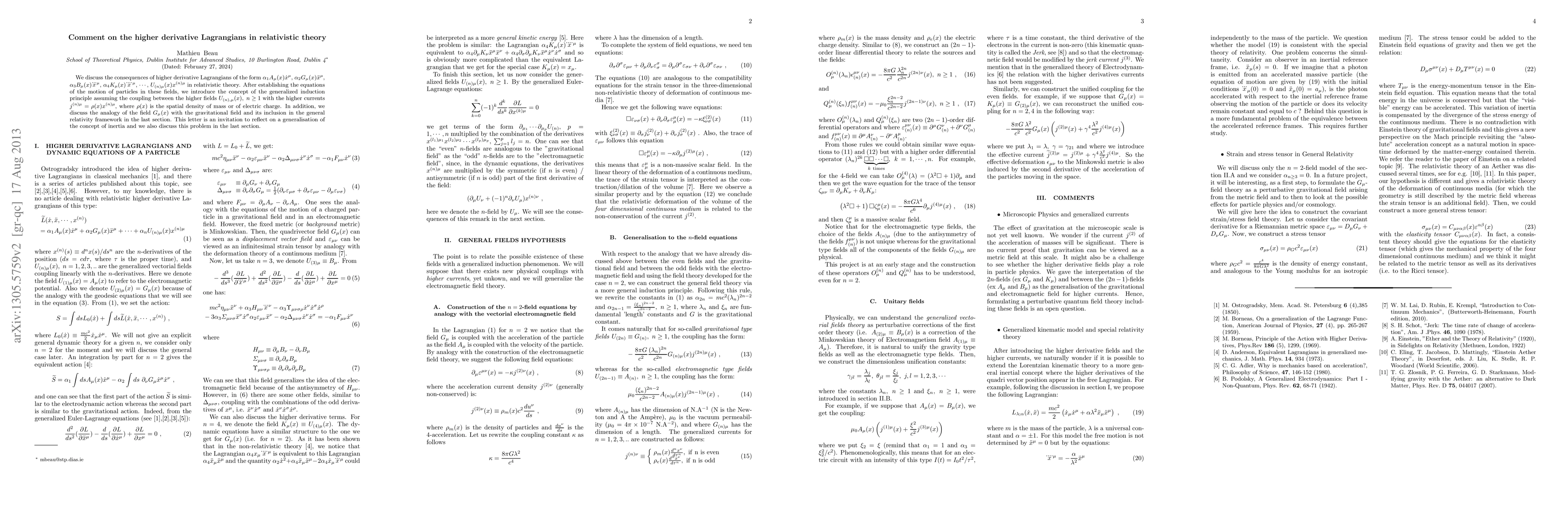 This paper explores the implications of higher derivative Lagrangians in relativistic theory, deriving equations of motion for particles in these fields and introducing a generalized induction principle. It also discusses the analogy of a specific field with gravity and its integration into general relativity, inviting reflection on a broader concept of inertia.