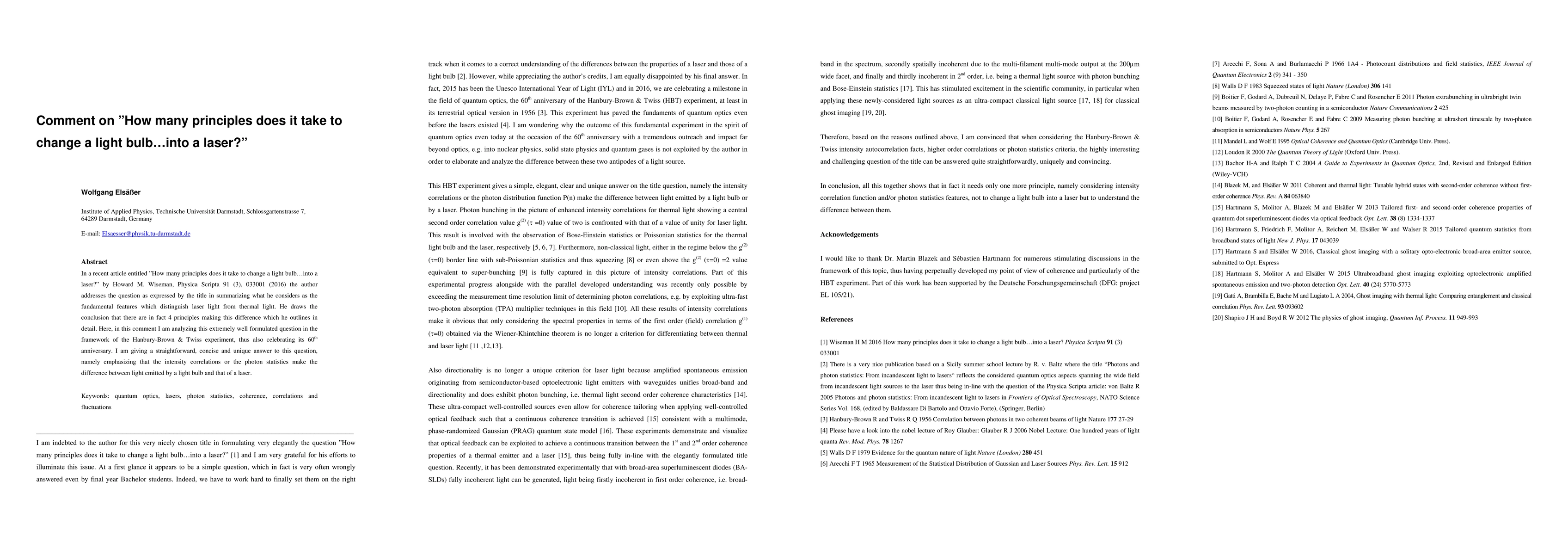 In this comment on "How many principles does it take to change a light bulb ... into a laser?" by Howard M. Wiseman, Physica Scripta 91 (3), 033001 (2016) I am analyzing this extremely nicely formulated question in the framework of the Hanbury-Brown & Twiss experiment thus celebrating also its 60th anniversary. I am giving a straightforward, concise and unique answer on this question, emphasizing that the intensity correlations or the photon statistics make the difference between a light bulb and a laser.