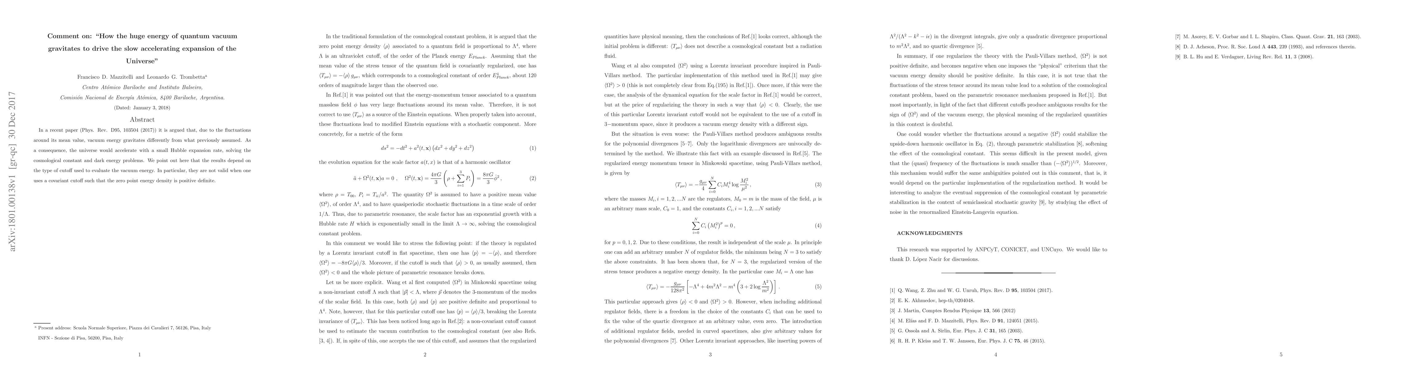 In a recent paper (Phys. Rev. D95, 103504 (2017)) it is argued that, due to the fluctuations around its mean value, vacuum energy gravitates differently from what previously assumed. As a consequence, the universe would accelerate with a small Hubble expansion rate, solving the cosmological constant and dark energy problems. We point out here that the results depend on the type of cutoff used to evaluate the vacuum energy. In particular, they are not valid when one uses a covariant cutoff such that the zero point energy density is positive definite.