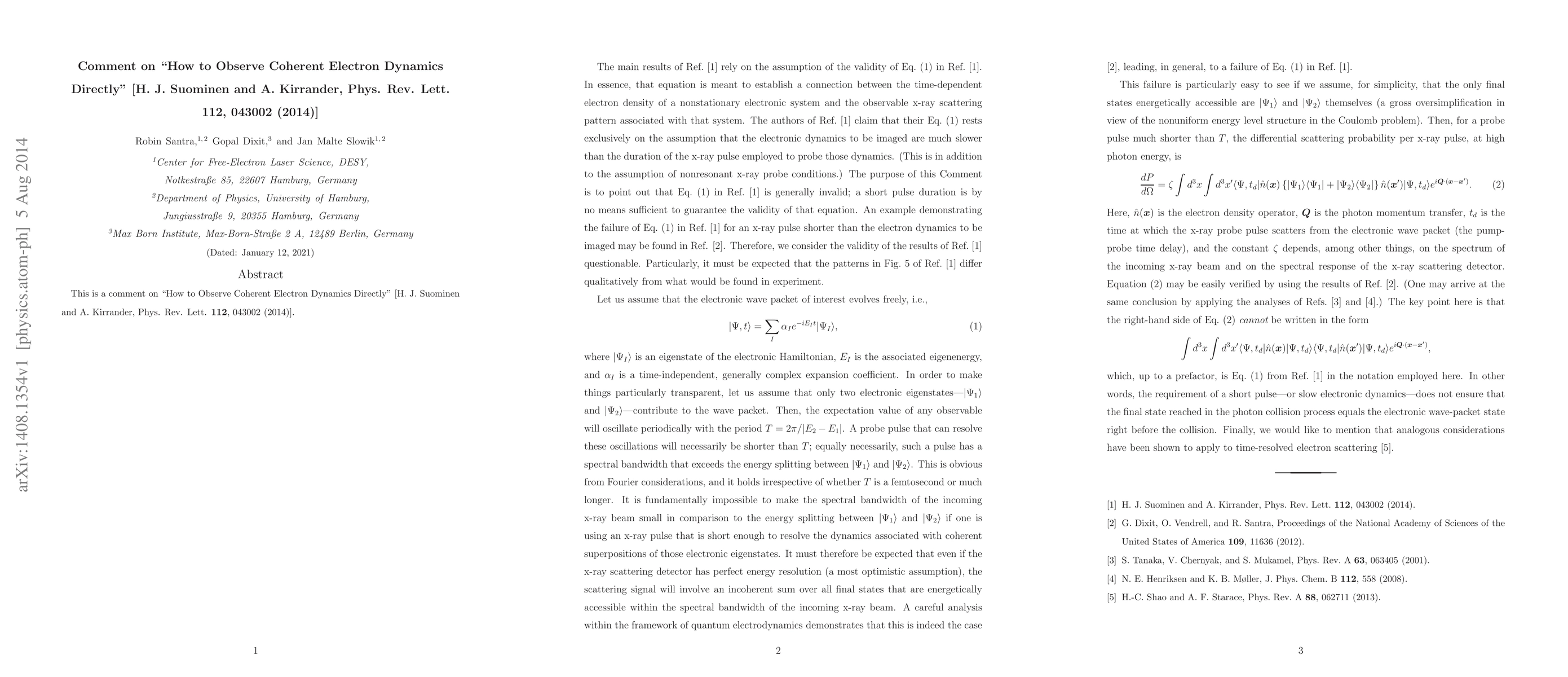 This is a comment on "How to Observe Coherent Electron Dynamics Directly" [H. J. Suominen and A. Kirrander, Phys. Rev. Lett. 112, 043002 (2014)].