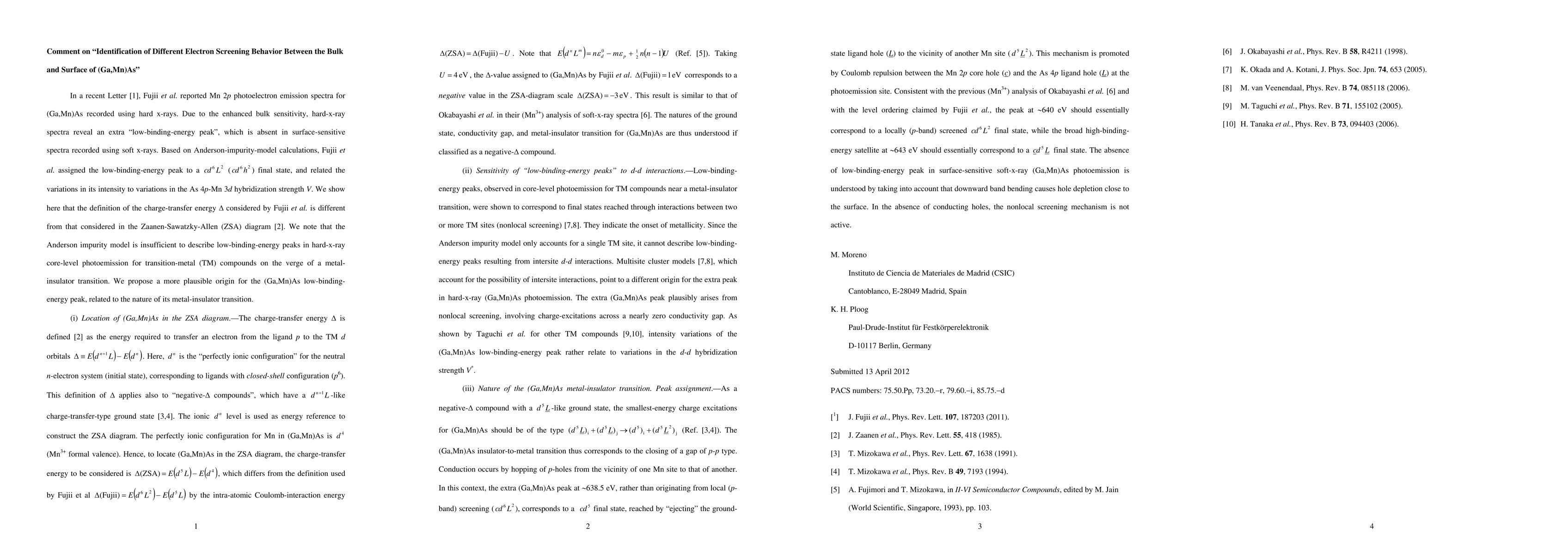 In a recent Letter [Phys. Rev. Lett. 107, 187203 (2011)], Fujii et al. reported Mn 2p photoelectron emission spectra for (Ga,Mn)As recorded using hard x-rays. Due to the enhanced bulk sensitivity, hard-x-ray spectra reveal an extra "low-binding-energy peak", which is absent in surface-sensitive spectra recorded using soft x-rays. Based on Anderson-impurity-model calculations, Fujii et al. assigned the low-binding-energy peak to a cd6L2 final state, and related the variations in its intensity to variations in the As 4p-Mn 3d hybridization strength V. We show here that the definition of the charge-transfer energy considered by Fujii et al. is different from that considered in the Zaanen-Sawatzky-Allen diagram. We note that the Anderson impurity model is insufficient to describe low-binding-energy peaks in hard-x-ray core-level photoemission for transition-metal compounds on the verge of a metal-insulator transition. We propose a more plausible origin for the (Ga,Mn)As low-binding-energy peak, related to the nature of its metal-insulator transition.