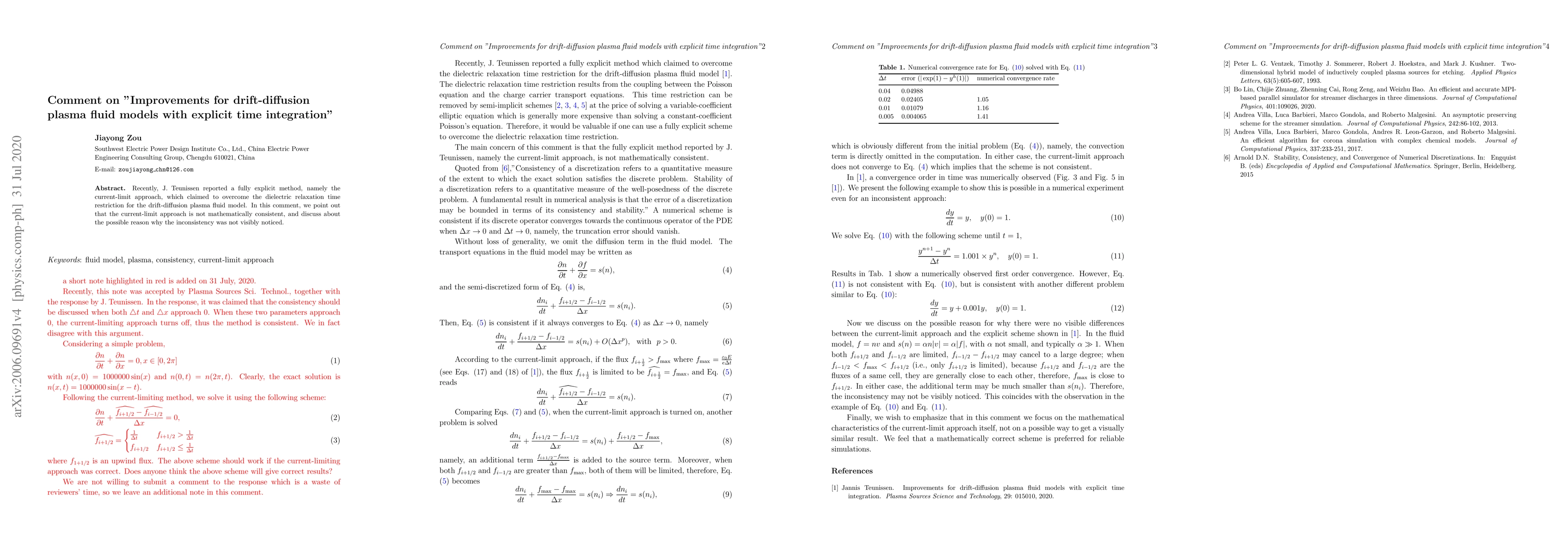 Recently, J. Teunissen reported a fully explicit method, namely the current-limit approach, which claimed to overcome the dielectric relaxation time restriction for the drift-diffusion plasma fluid model. In this comment, we point out that the current-limit approach is not mathematically consistent, and discuss about the possible reason why the inconsistency was not visibly noticed.