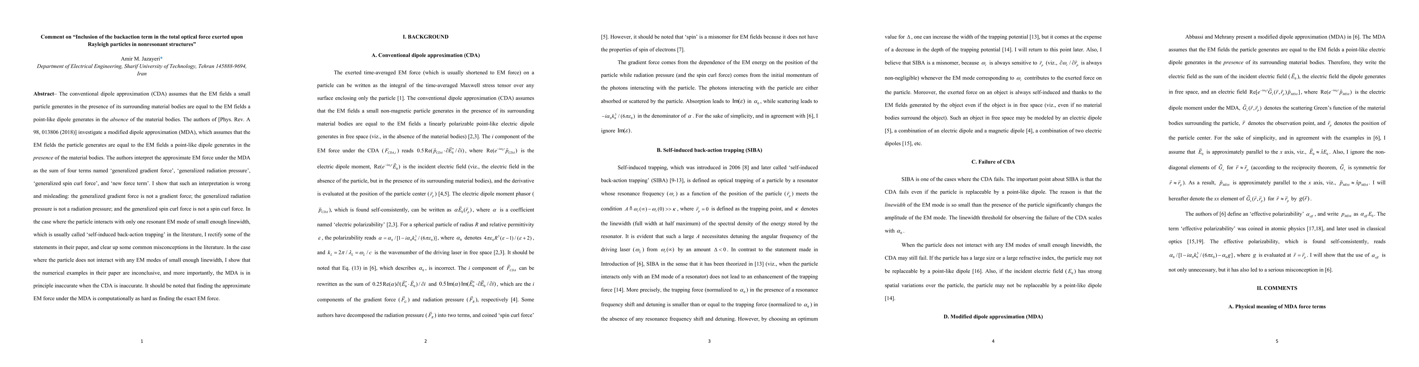 The conventional dipole approximation (CDA) assumes that the EM fields a small particle generates in the presence of its surrounding material bodies are equal to the EM fields a point-like dipole generates in the absence of the material bodies. The authors of [Phys. Rev. A 98, 013806 (2018)] investigate a modified dipole approximation (MDA), which assumes that the EM fields the particle generates are equal to the EM fields a point-like dipole generates in the presence of the material bodies. The authors interpret the approximate EM force under the MDA as the sum of four terms named 'generalized gradient force', 'generalized radiation pressure', 'generalized spin curl force', and 'new force term'. I show that such an interpretation is wrong and misleading: the generalized gradient force is not a gradient force; the generalized radiation pressure is not a radiation pressure; and the generalized spin curl force is not a spin curl force. In the case where the particle interacts with only one resonant EM mode of small enough linewidth, which is usually called 'self-induced back-action trapping' in the literature, I rectify some of the statements in their paper, and clear up some common misconceptions in the literature. In the case where the particle does not interact with any EM modes of small enough linewidth, I show that the numerical examples in their paper are inconclusive, and more importantly, the MDA is in principle inaccurate when the CDA is inaccurate. It should be noted that finding the approximate EM force under the MDA is computationally as hard as finding the exact EM force.