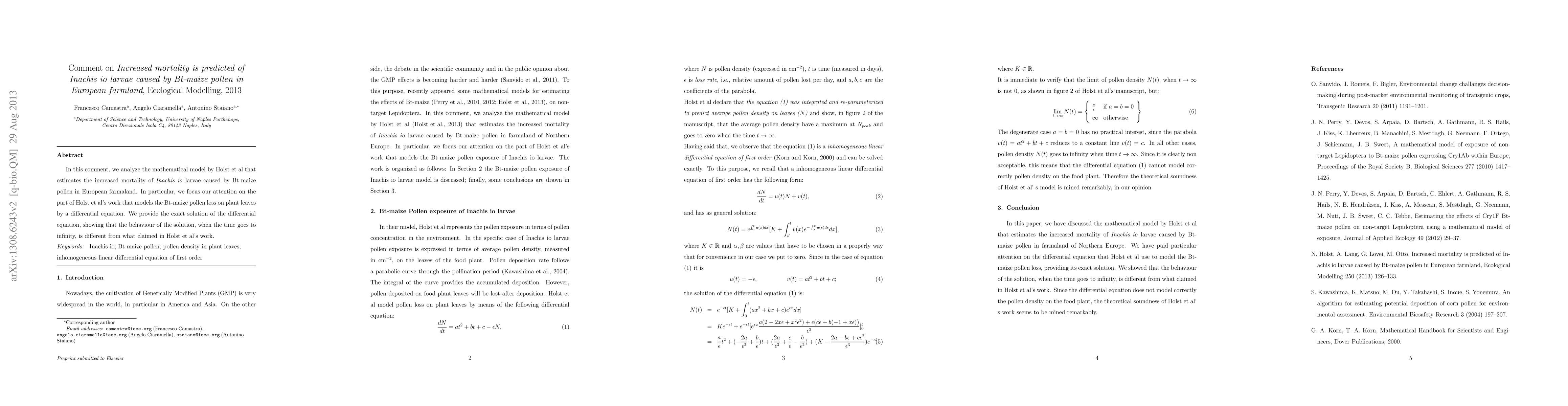 In this comment, we analyze the mathematical model by Holst et al that estimates the increased mortality of Inachis io larvae caused by Bt-maize pollen in European farmaland. In particular, we focus our attention on the part of Holst et al's work that models the Bt-maize pollen loss on plant leaves by a differential equation. We provide the exact solution of the differential equation, showing that the behaviour of the solution, when the time goes to infinity, is different from what claimed in Holst et al's work.