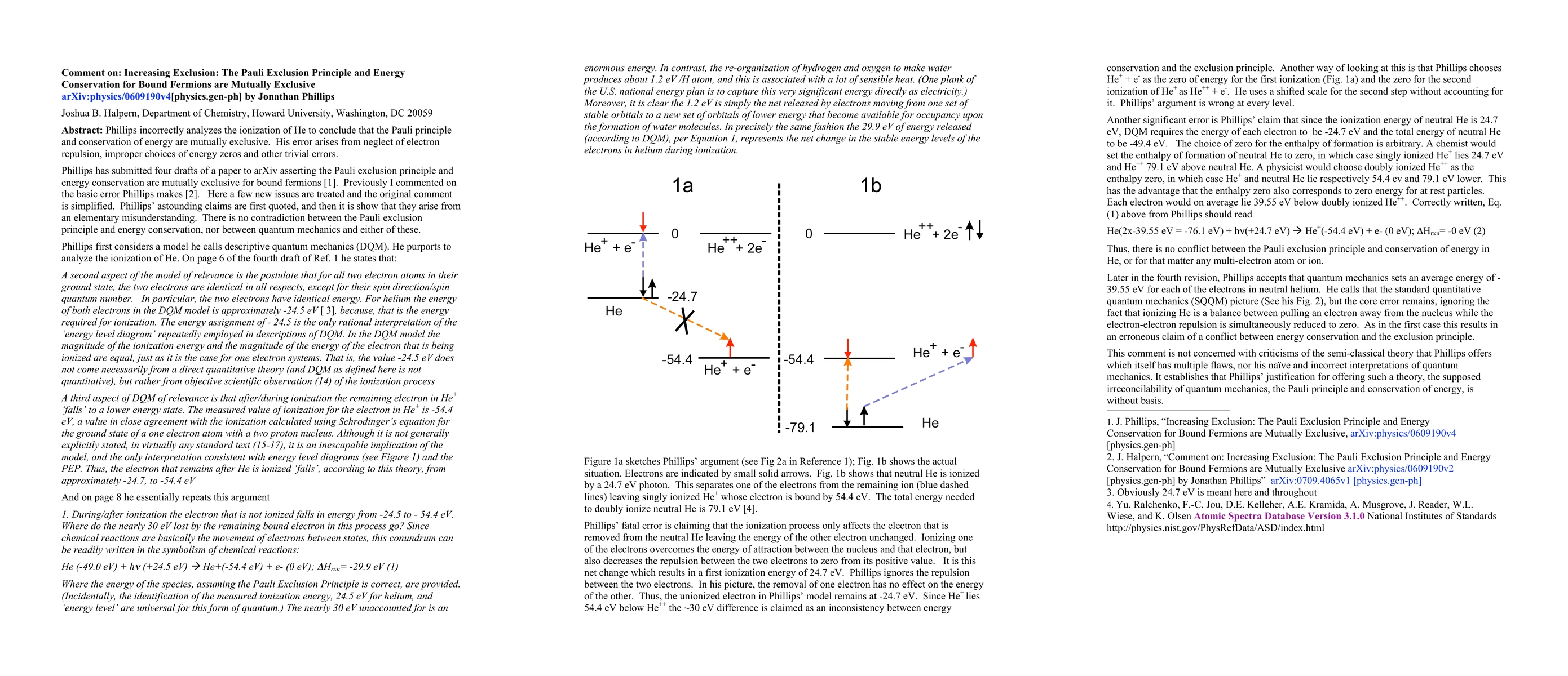 Phillips incorrectly analyzes the ionization of He to conclude that the Pauli exclusion principle and conservation of energy are mutually exclusive. His error arises from neglect of electron repulsion, improper choices of energy zeros and other trivial errors.