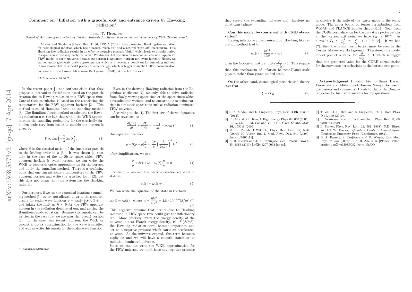 This paper critiques the Hawking-like radiation model proposed by Modak and Singleton for cosmological inflation, arguing that the turn-on mechanism is infeasible in the Friedmann-Robertson-Walker (FRW) model due to the absence of an event horizon. It also points out that the model's predictions exceed the CMB normalization constraints.