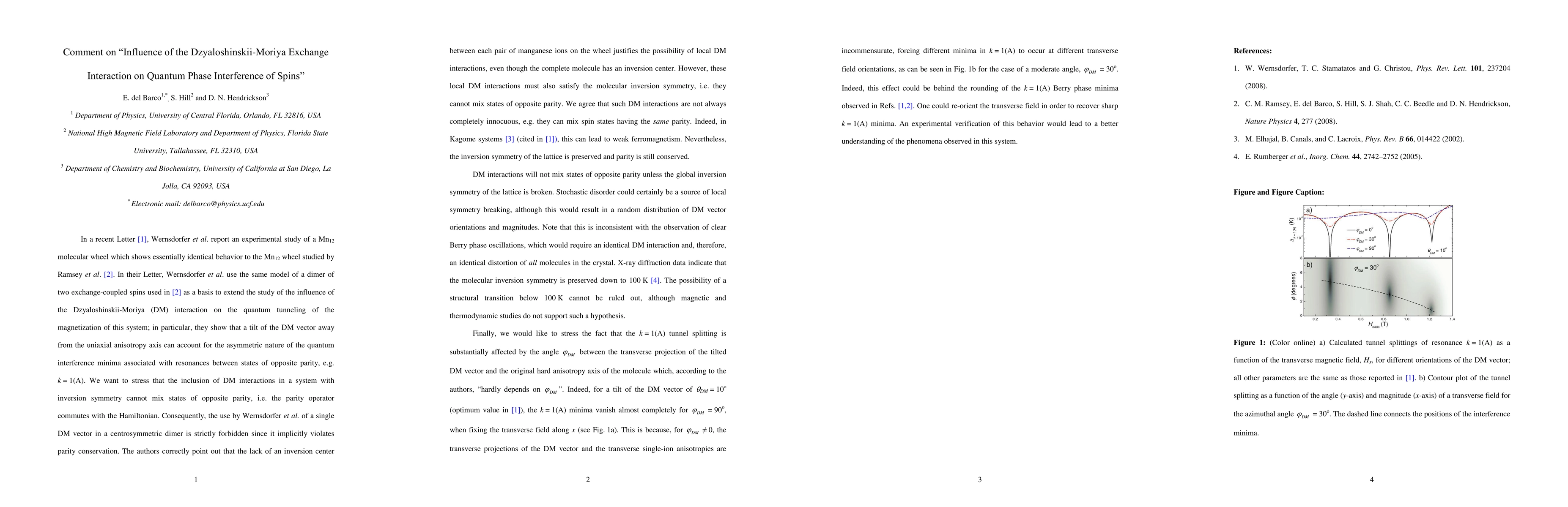 In a recent Letter [1], Wernsdorfer et al. report an experimental study of a Mn12 molecular wheel which shows essentially identical behavior to the Mn12 wheel studied by Ramsey et al. [2]. In their Letter, Wernsdorfer et al. use the same model of a dimer of two exchange-coupled spins used in [2] as a basis to extend the study of the influence of the Dzyaloshinskii-Moriya (DM) interaction on the quantum tunneling of the magnetization of this system; in particular, they show that a tilt of the DM vector away from the uniaxial anisotropy axis can account for the asymmetric nature of the quantum interference minima associated with resonances between states of opposite parity, e.g., k = 1(A). We want to stress that the inclusion of DM interactions in a system with inversion symmetry cannot mix states of opposite parity; i.e., the parity operator commutes with the Hamiltonian. Consequently, the use by Wernsdorfer et al. of a single DM vector in a centrosymmetric dimer is strictly forbidden since it implicitly violates parity conservation. The authors correctly point out that the lack of an inversion center between each pair of manganese ions on the wheel justifies the possibility of local DM interactions, even though the complete molecule has an inversion center. However, these local DM interactions must also satisfy the molecular inversion symmetry; i.e., they cannot mix states of opposite parity.We agree that such DM interactions are not always completely innocuous; e.g., they can mix spin states having the same parity. Indeed, in kagome systems [3] (cited in [1]), this can lead to weak ferromagnetism. Nevertheless, the inversion symmetry of the lattice is preserved and parity is still conserved.