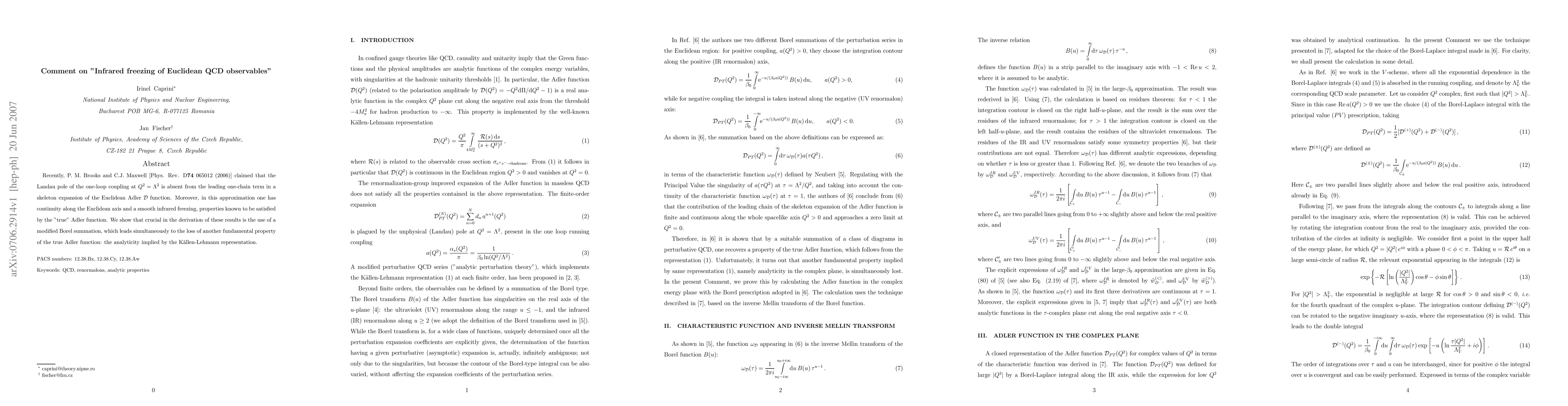 Recently, P. M. Brooks and C.J. Maxwell [Phys. Rev. D{\bf 74} 065012 (2006)] claimed that the Landau pole of the one-loop coupling at $Q^2=\Lambda^2$ is absent from the leading one-chain term in a skeleton expansion of the Euclidean Adler ${\cal D}$ function. Moreover, in this approximation one has continuity along the Euclidean axis and a smooth infrared freezing, properties known to be satisfied by the "true" Adler function. We show that crucial in the derivation of these results is the use of a modified Borel summation, which leads simultaneously to the loss of another fundamental property of the true Adler function: the analyticity implied by the K\"allen-Lehmann representation.