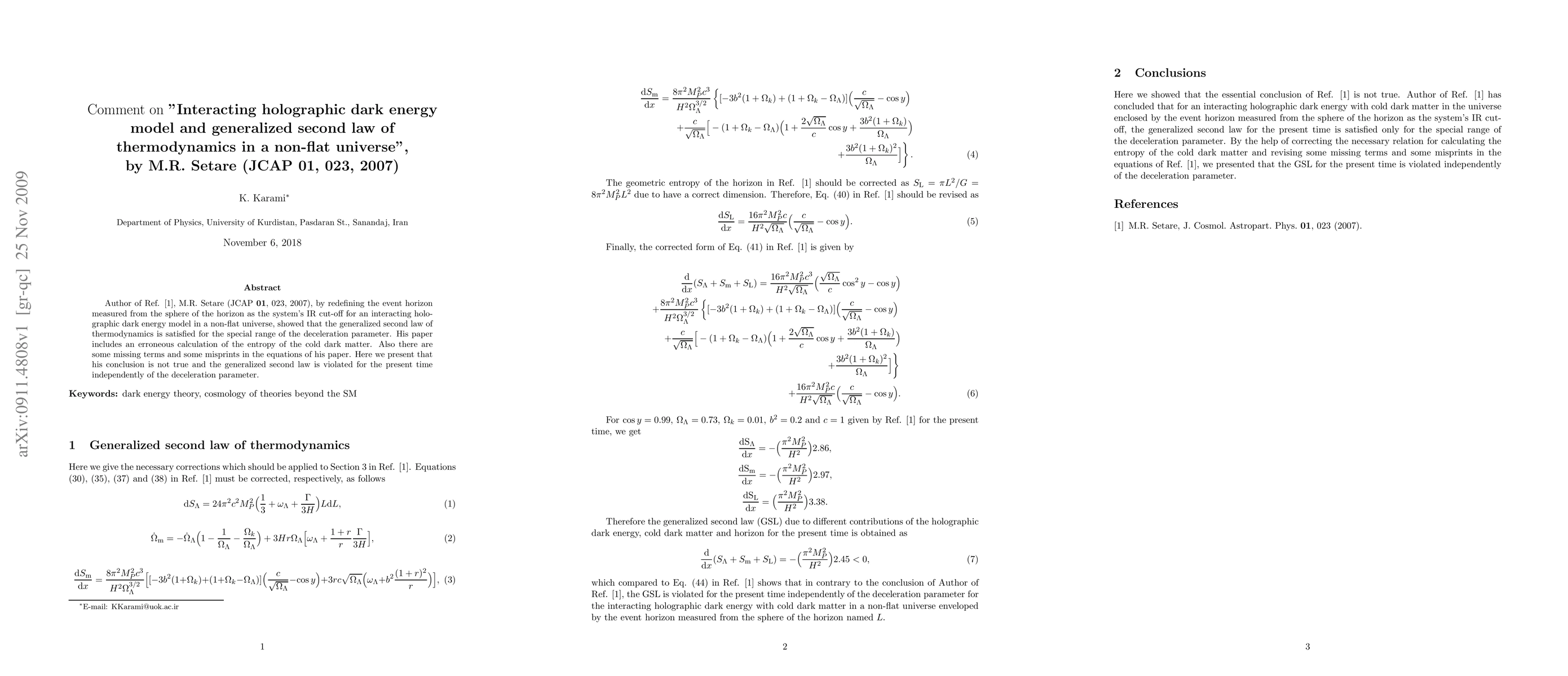 This paper critiques M.R. Setare's work on an interacting holographic dark energy model, finding that his conclusion about the generalized second law of thermodynamics being satisfied is incorrect due to an erroneous entropy calculation, missing terms, and misprints, leading to the conclusion that the generalized second law is violated in the present time.
