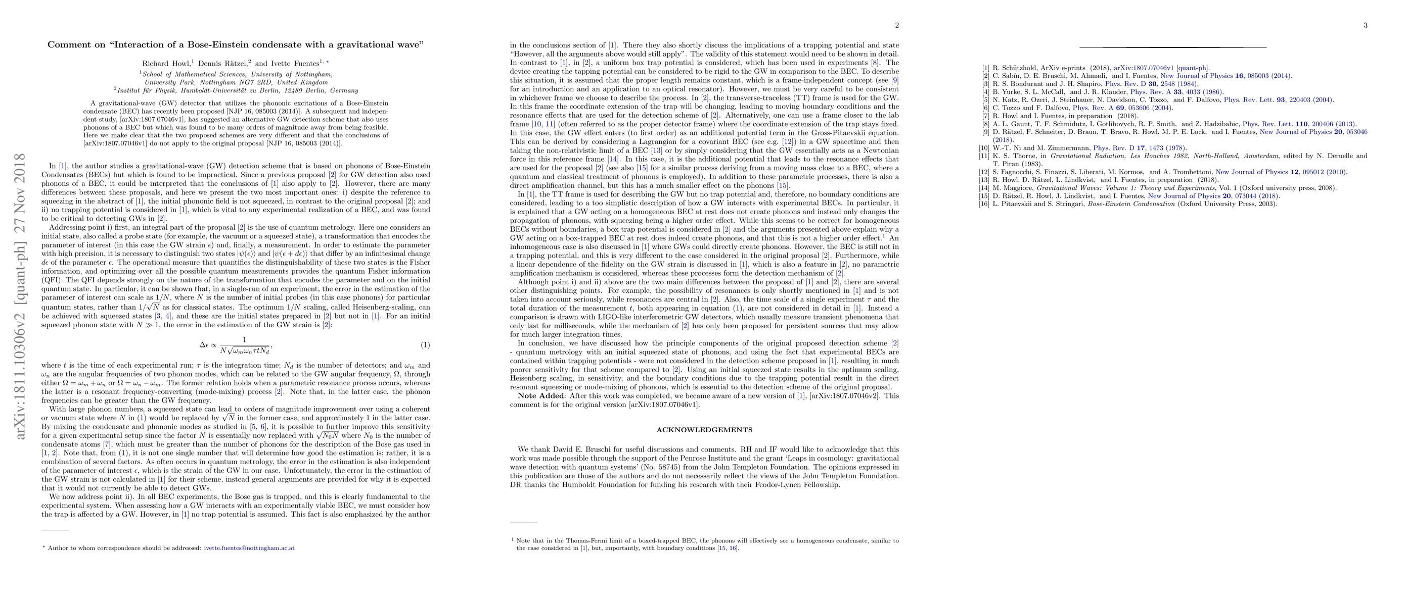 A gravitational-wave (GW) detector that utilizes the phononic excitations of a Bose-Einstein condensate (BEC) has recently been proposed [NJP 16, 085003 (2014)]. A subsequent and independent study, [arXiv:1807.07046v1], has suggested an alternative GW detection scheme that also uses phonons of a BEC but which was found to be many orders of magnitude away from being feasible. Here we make clear that the two proposed schemes are very different and that the conclusions of [arXiv:1807.07046v1] do not apply to the original proposal [NJP 16, 085003 (2014)].