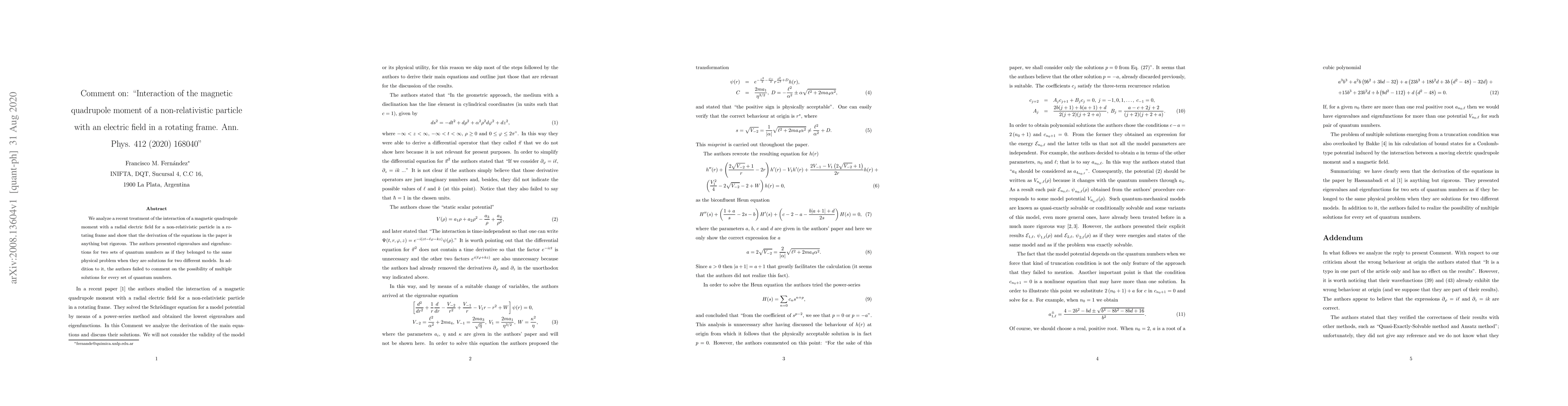 We analyze a recent treatment of the interaction of a magnetic quadrupole moment with a radial electric field for a non-relativistic particle in a rotating frame and show that the derivation of the equations in the paper is anything but rigorous. The authors presented eigenvalues and eigenfunctions for two sets of quantum numbers as if they belonged to the same physical problem when they are solutions for two different models. In addition to it, the authors failed to comment on the possibility of multiple solutions for every set of quantum numbers.