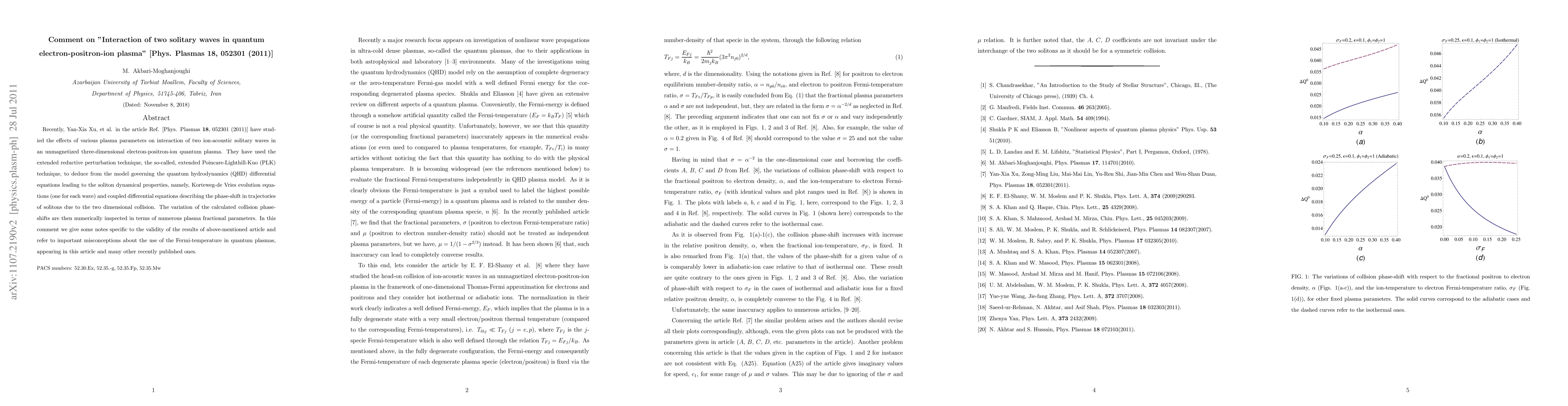 Recently, Yan-Xia Xu, et al. in the article Ref. [Phys. Plasmas \textbf{18}, 052301 (2011)] have studied the effects of various plasma parameters on interaction of two ion-acoustic solitary waves in an unmagnetized three-dimensional electron-positron-ion quantum plasma. They have used the extended reductive perturbation technique, the so-called, extended Poincare'-Lighthill-Kuo (PLK) technique, to deduce from the model governing the quantum hydrodynamics (QHD) differential equations leading to the soliton dynamical properties, namely, Korteweg-de Vries evolution equations (one for each wave) and coupled differential equations describing the phase-shift in trajectories of solitons due to the two dimensional collision. The variation of the calculated collision phase-shifts are then numerically inspected in terms of numerous plasma fractional parameters. In this comment we give some notes specific to the validity of the results of above-mentioned article and refer to important misconceptions about the use of the Fermi-temperature in quantum plasmas, appearing in this article and many other recently published ones.