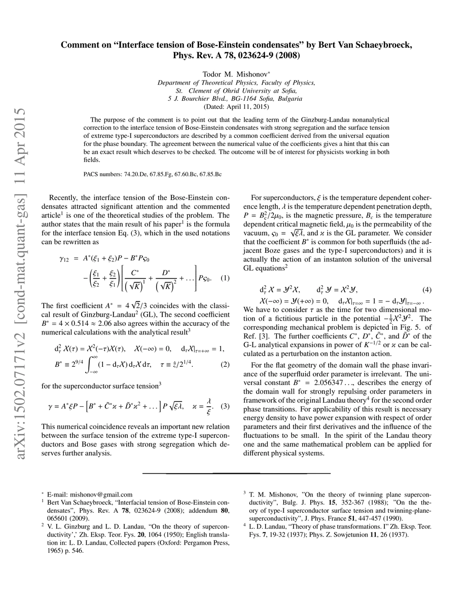 The purpose of the comment is to point out that the leading term of the Ginzburg-Landau nonanalytical correction to the interface tension of Bose-Einstein condensates with strong segregation and the surface tension of extreme type-I superconductors are described by a common coefficient derived from the universal equation for the phase boundary. The agreement between the numerical value of the coefficients gives a hint that this can be an exact result which deserves to be checked. The outcome will be of interest for physicists working in both fields.