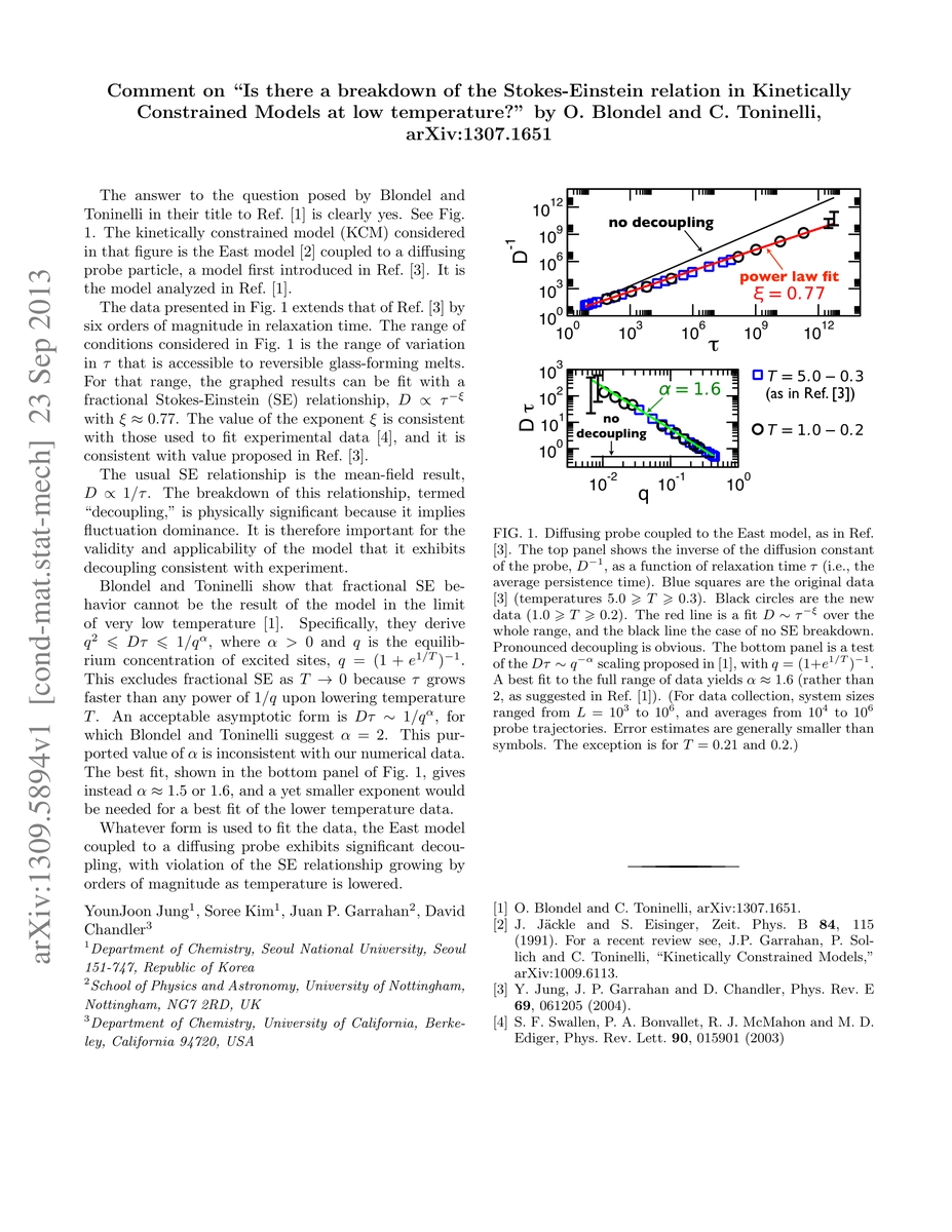 We consider the diffusion constant, D, of a probe particle coupled to the East model, extending previous numerical results for this model to encompass a total of twelve orders of magnitude in relaxation time, {\tau}. Our considerations thus cover the full range of relaxation times relevant to experimental studies of reversible glass formers. Throughout this range, we show that the results of the model are consistent with a fractional Stokes-Einstein law, D \propto {\tau}^{-{\xi}} with {\xi} \approx 0.77. The same data can also be fit by relating D{\tau} to the East model excitation concentration q, specifically, D{\tau} \sim 1/q^{\alpha} with {\alpha} \approx 1.6. In either case, breakdown of the Stokes-Einstein relation in this kinetically constrained model is unquestionable and large.