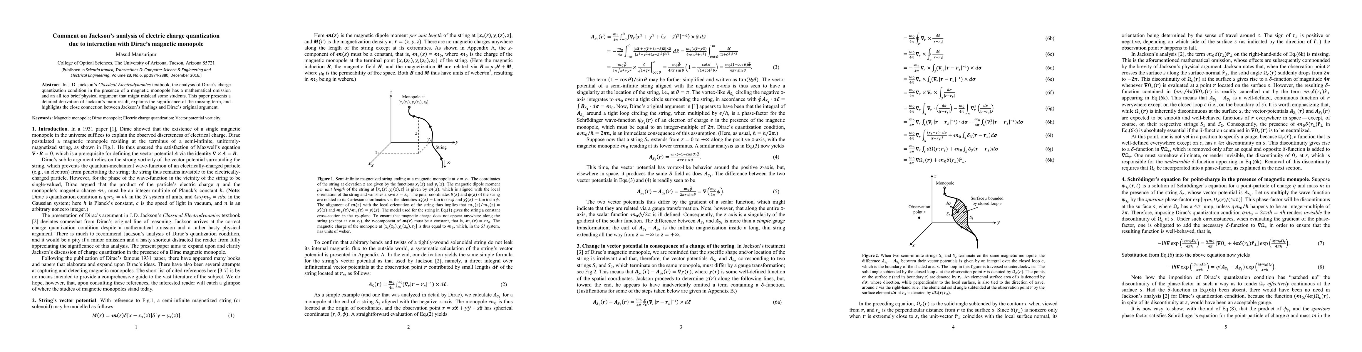 This paper corrects and elaborates on J.D. Jackson's analysis of electric charge quantization in classical electrodynamics, addressing a mathematical omission and providing a clearer physical explanation to prevent student misconceptions. It also connects Jackson's findings more thoroughly to Dirac's original theory.