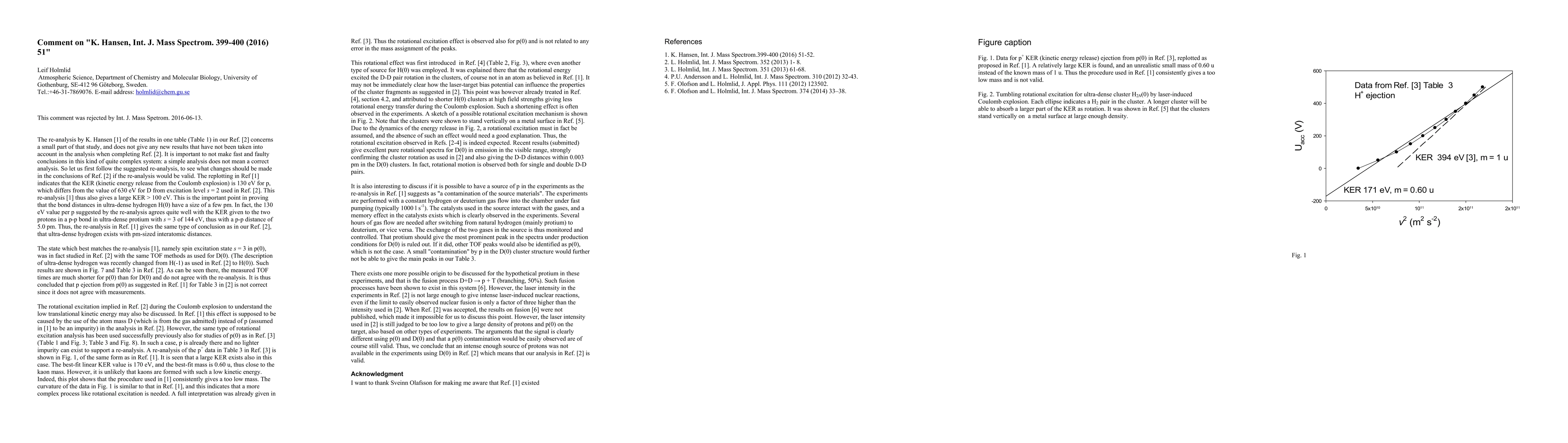 The comment by K. Hansen suggests that the time-of-flight mass spectrometry data in one table in our paper from 2103 in IJMS should be due to a proton contamination and correspond to protons p instead of deuterons D. The evidence for such a suggestion is a re-plotting of our data, giving a bond distance of 5.0 pm instead of 2.3 pm, corresponding to state s = 3 instead of s = 2 in the ultra-dense hydrogen. However, protium has indeed been studied on the next pages in our paper, giving shorter time-of-flights as expected. A replotting of our protium results as suggested by Hansen gives a best fit mass of 0.6 u, showing that the suggested procedure gives consistently too small mass. Hansen also rejects the rotational energy transfer model as due to our use of D in the analysis of the data. However, this model has been applied successfully in two previous publications, including experiments using protium. Hansen also suggests that the protium is due to a contamination of the source; however, the gas feed (H2 or D2) and its result is well controlled and monitored. The most likely source of protons was instead laser-induced nuclear fusion, but the laser intensity in these experiments was a factor three too low to give strong fusion. Thus, the suggestion by Hansen is not valid.