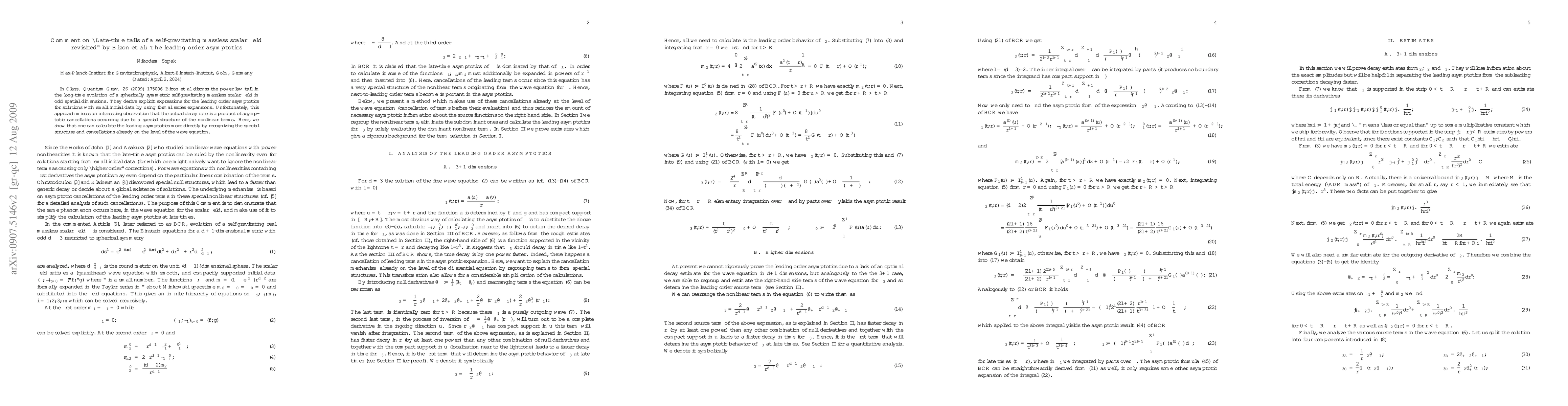 In Class. Quantum Grav. 26 (2009) 175006 (arXiv:0812.4333v3) Bizon et al discuss the power-law tail in the long-time evolution of a spherically symmetric self-gravitating massless scalar field in odd spatial dimensions. They derive explicit expressions for the leading order asymptotics for solutions with small initial data by using formal series expansions. Unfortunately, this approach misses an interesting observation that the actual decay rate is a product of asymptotic cancellations occurring due to a special structure of the nonlinear terms. Here, we show that one can calculate the leading asymptotics more directly by recognizing the special structure and cancellations already on the level of the wave equation.
