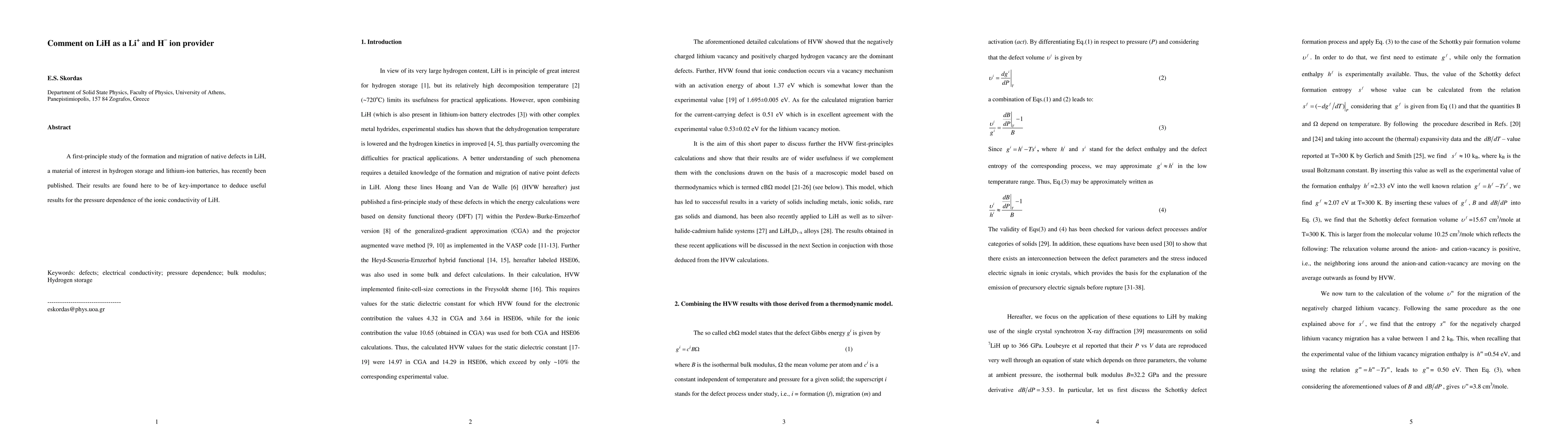 A first-principle study of the formation and migration of native defects in LiH, a material of interest in hydrogen storage and lithium-ion batteries, has recently been published. Their results are found here to be of key-importance to deduce useful results for the pressure dependence of the ionic conductivity of LiH.