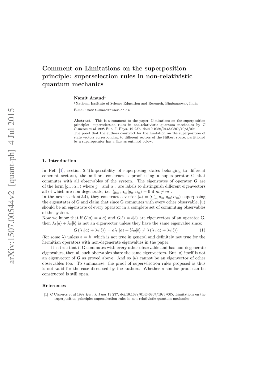This is a comment to the paper, Limitations on the superposition principle: superselection rules in non-relativistic quantum mechanics by C Cisneros et al 1998 Eur. J. Phys. 19 237. doi:10.1088/0143-0807/19/3/005. The proof that the authors construct for the limitation on the superposition of state vectors corresponding to different sectors of the Hilbert space, partitioned by a superoperator has a flaw as outlined below.