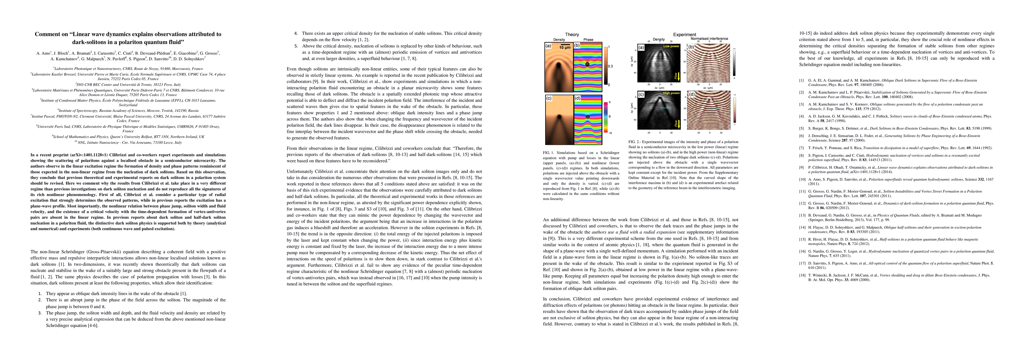 In a recent preprint (arXiv:1401.1128v1) Cilibrizzi and co-workers report experiments and simulations showing the scattering of polaritons against a localised obstacle in a semiconductor microcavity. The authors observe in the linear excitation regime the formation of density and phase patterns reminiscent of those expected in the non-linear regime from the nucleation of dark solitons. Based on this observation, they conclude that previous theoretical and experimental reports on dark solitons in a polariton system should be revised. Here we comment why the results from Cilibrizzi et al. take place in a very different regime than previous investigations on dark soliton nucleation and do not reproduce all the signatures of its rich nonlinear phenomenology. First of all, Cilibrizzi et al. consider a particular type of radial excitation that strongly determines the observed patterns, while in previous reports the excitation has a plane-wave profile. Most importantly, the nonlinear relation between phase jump, soliton width and fluid velocity, and the existence of a critical velocity with the time-dependent formation of vortex-antivortex pairs are absent in the linear regime. In previous reports about dark soliton and half-dark soliton nucleation in a polariton fluid, the distinctive dark soliton physics is supported both by theory (analytical and numerical) and experiments (both continuous wave and pulsed excitation).