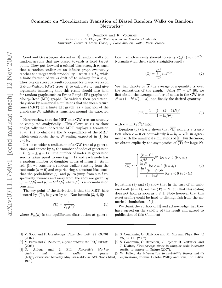 This paper builds on Sood and Grassberger's study of biased random walks on random graphs, confirming the critical bias strength b_c where transitions occur in mean return time (MRT). It analytically computes MRT on Galton-Watson trees, revealing a different N dependence than previously expected, contradicting the scaling behavior proposed for b<b_c.