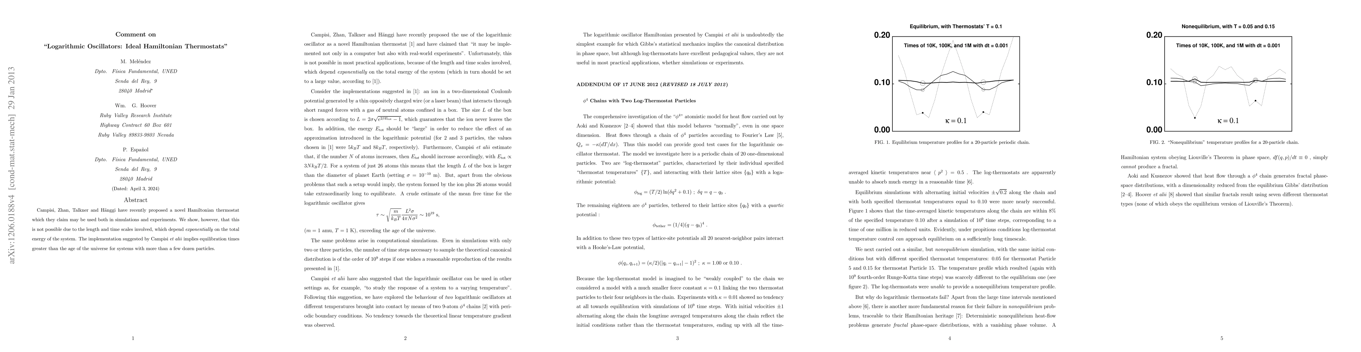 Campisi, Zhan, Talkner and H\"anggi have recently proposed a novel Hamiltonian thermostat which they claim may be used both in simulations and experiments [arXiv:1203.5968v4]. We show, however, that this is not possible due to the length and time scales involved, which depend exponentially on the total energy of the system. The implementation suggested by Campisi et alii implies equilibration times greater than the age of the universe for systems with more than a few dozen particles.