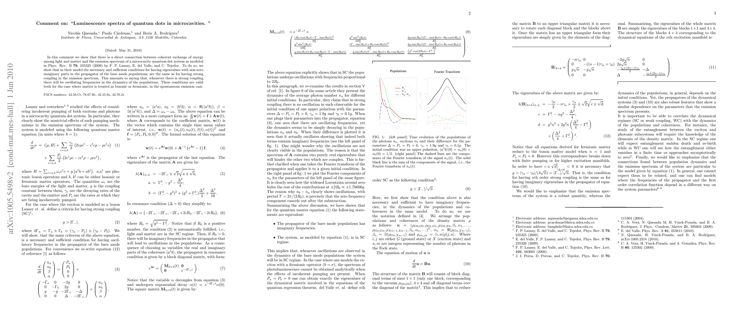 In this comment we show that there is a direct connection between coherent exchange of energy among light and matter and the emission spectrum of a microcavity quantum dot system as modeled in Phys. Rev. B 79, 235325 (2009) [arXiv:0807.3194] by F. P. Laussy, E. del Valle, and C. Tejedor. To do so, we show that in their model the necessary and sufficient conditions for having eigenvalues with non-zero imaginary parts in the propagator of the bare mode populations, are the same as for having strong coupling in the emission spectrum. This amounts to saying that, whenever there is strong coupling there will be oscillating frequencies in the dynamics of the populations. These conditions are valid both for the case where matter is treated as bosonic or fermionic, in the spontaneous emission case.