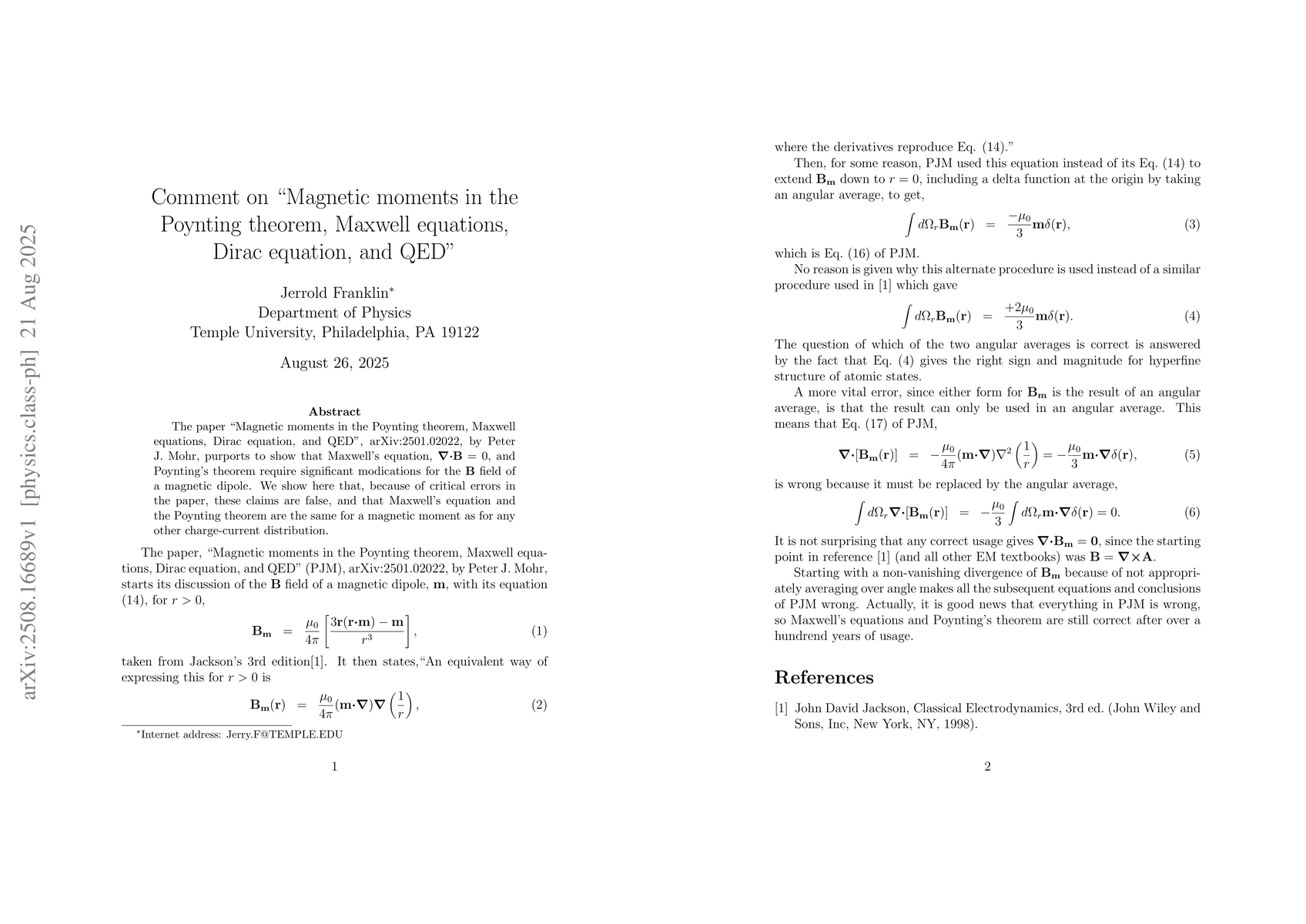 The paper ``Magnetic moments in the Poynting theorem, Maxwell equations, Dirac equation, and QED", arXiv:2501.02022, by Peter J. Mohr, purports to show that Maxwell's equation, $\mathbf{\nabla}\cdot{\bf B}=0$, and Poynting's theorem require significant modications for the $\bf B$ field of a magnetic dipole. We show here that, because of critical errors in the paper, these claims are false, and that Maxwell's equation and the Poynting theorem are the same for a magnetic moment as for any other charge-current distribution.