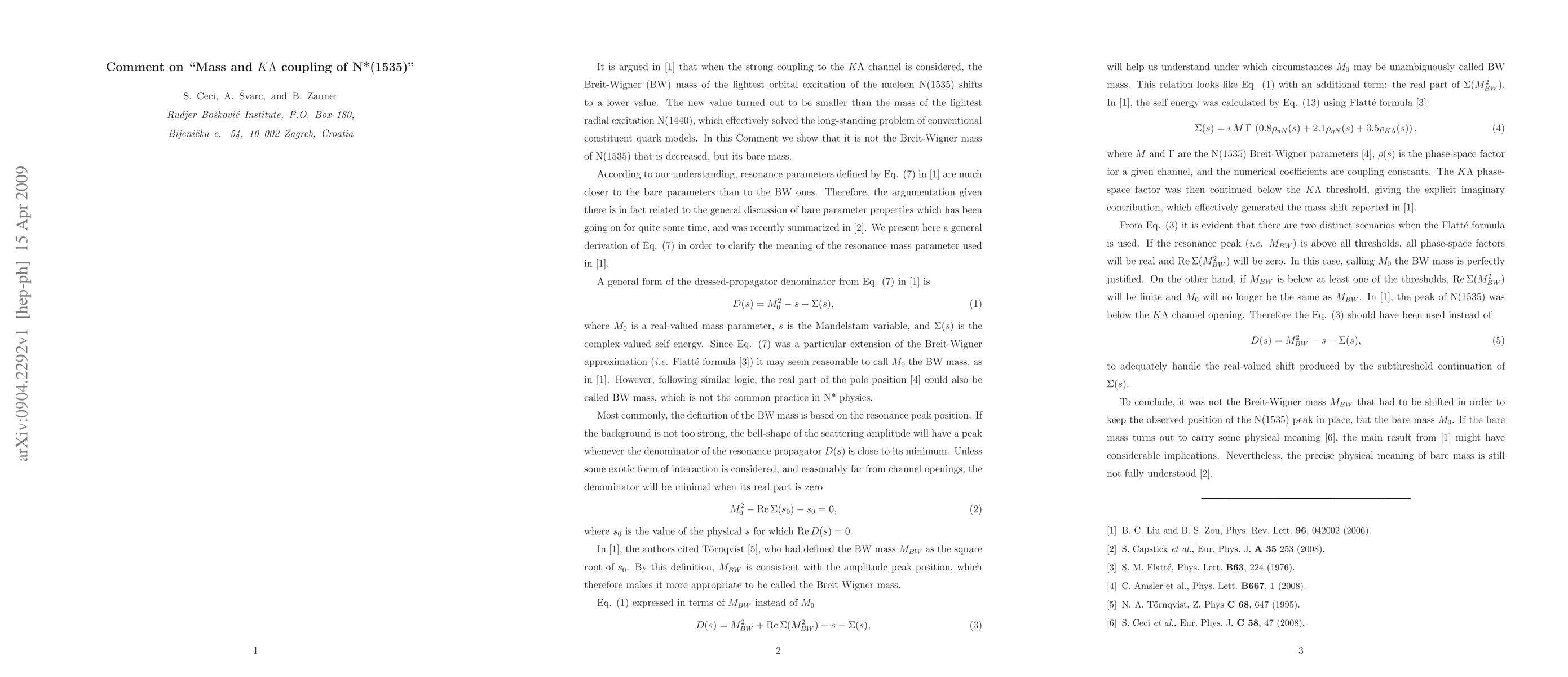 It is argued in [1] that when the strong coupling to the K Lambda channel is considered, Breit-Wigner mass of the lightest orbital excitation of the nucleon N(1535) shifts to a lower value. The new value turned out to be smaller than the mass of the lightest radial excitation N(1440), which effectively solved the long-standing problem of conventional constituent quark models. In this Comment we show that it is not the Breit-Wigner mass of N(1535) that is decreased, but its bare mass. [1] B. C. Liu and B. S. Zou, Phys. Rev. Lett. 96, 042002 (2006).