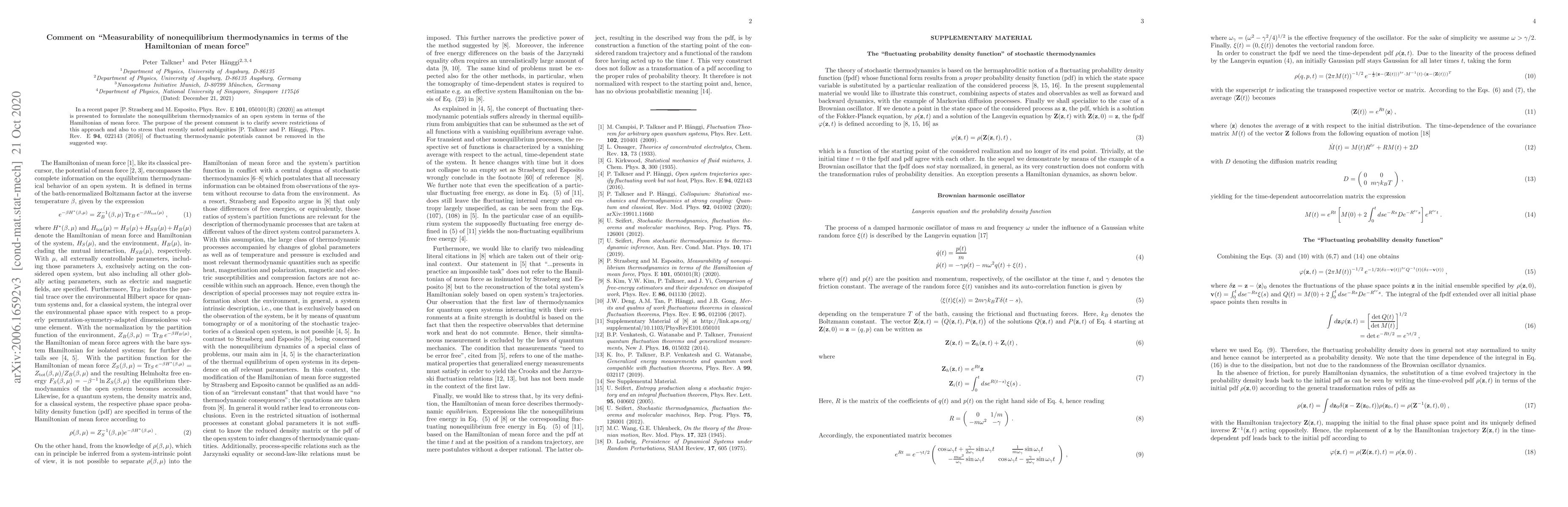 In a recent paper [P. Strasberg and M. Esposito, Phys. Rev. E {\bf 101}, 050101(R) (2020)] an attempt is presented to formulate the nonequilibrium thermodynamics of an open system in terms of the Hamiltonian of mean force. The purpose of the present comment is to clarify severe restrictions of this approach and also to stress that recently noted ambiguities [P. Talkner and P. H\"anggi, Phys. Rev. E {\bf 94}, 022143 (2016)] of fluctuating thermodynamic potentials cannot be removed in the suggested way.