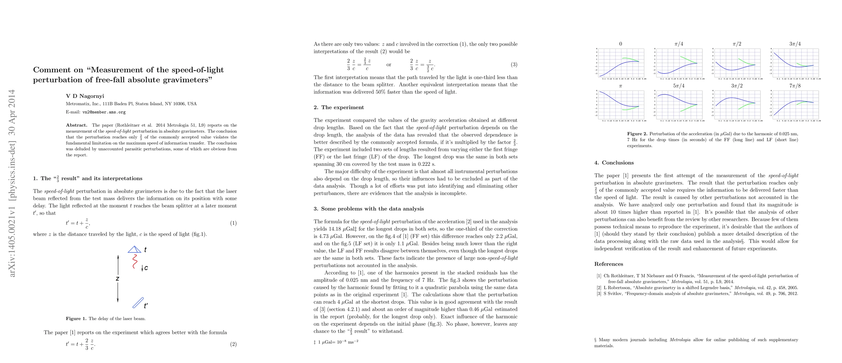 The paper (Rothleitner et al. 2014 Metrologia 51, L9) reports on the measurement of the speed-of-light perturbation in absolute gravimeters. The conclusion that the perturbation reaches only 2/3 of the commonly accepted value violates the fundamental limitation on the maximum speed of information transfer. The conclusion was deluded by unaccounted parasitic perturbations, some of which are obvious from the report.