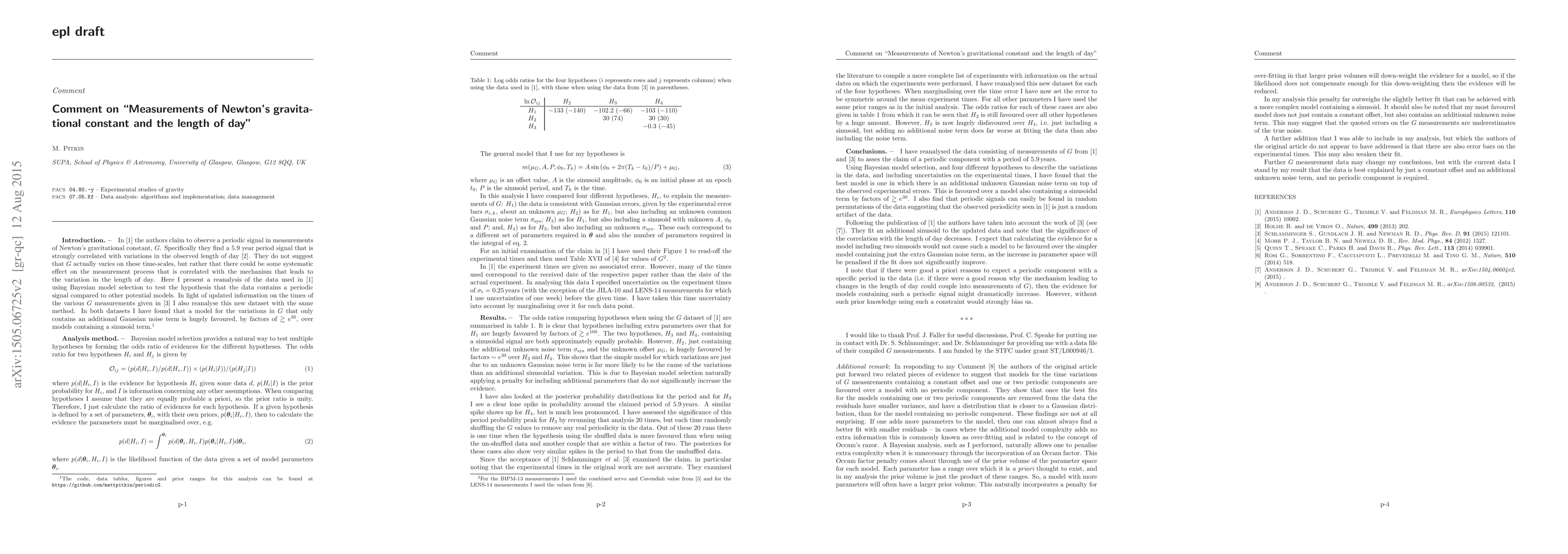 There have been recent claims (Anderson et al., EPL, 110, 10002) of a 5.9 year periodicity in measurements of Newton's gravitational constant, $G$, which show a very strong correlation with observed periodic variations in the length of the day. I have used Bayesian model comparison to test this claim compared to other hypotheses that could explain the variation in the $G$ measurements. I have used the data from the initial claim, and from an updated set of compiled $G$ measurements that more accurately reflect the experimental dates, and find that a model containing an additional unknown Gaussian noise component is hugely favoured, by factors of $\gtrsim e^{30}$, over two models allowing for a sinusoidal component.