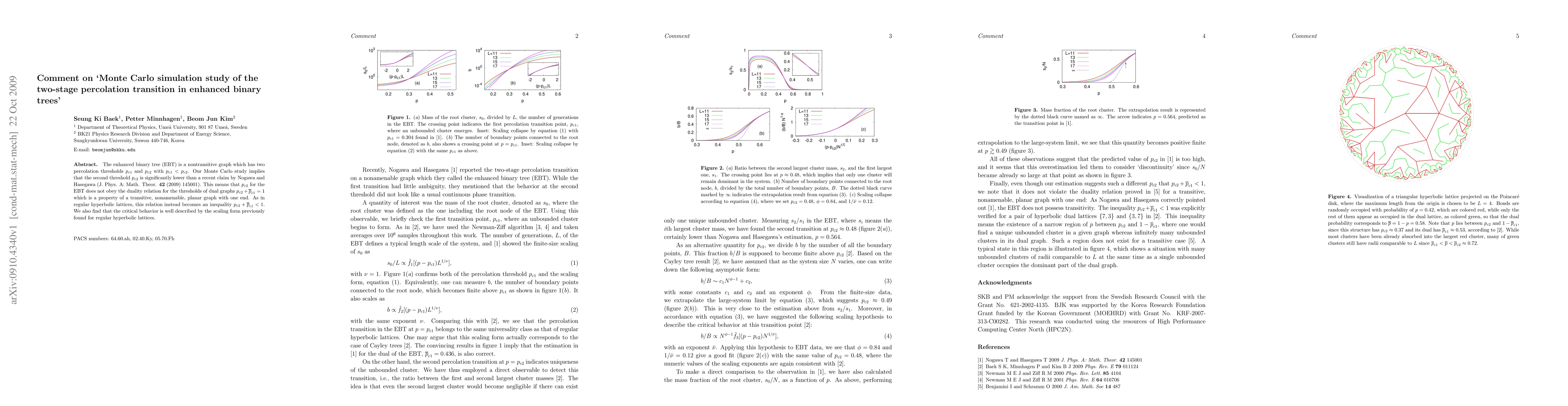 This study challenges previous claims about the second percolation threshold in enhanced binary trees, finding it significantly lower and not adhering to the duality relation typical of transitive, nonamenable planar graphs. The critical behavior aligns with scaling forms observed in regular hyperbolic lattices.