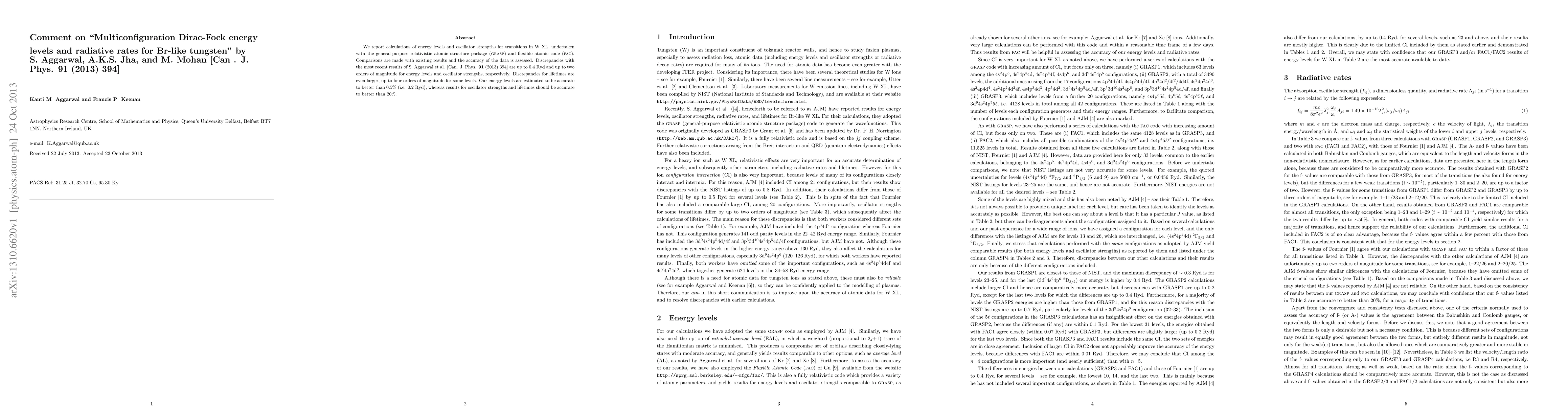 We report calculations of energy levels and oscillator strengths for transitions in W XL, undertaken with the general-purpose relativistic atomic structure package ({\sc grasp}) and flexible atomic code ({\sc fac}). Comparisons are made with existing results and the accuracy of the data is assessed. Discrepancies with the most recent results of S. Aggarwal et al. [Can. J. Phys. {\bf 91} (2013) 394] are up to 0.4 Ryd and up to two orders of magnitude for energy levels and oscillator strengths, respectively. Discrepancies for lifetimes are even larger, up to four orders of magnitude for some levels. Our energy levels are estimated to be accurate to better than 0.5% (i.e. 0.2 Ryd), whereas results for oscillator strengths and lifetimes should be accurate to better than 20%.