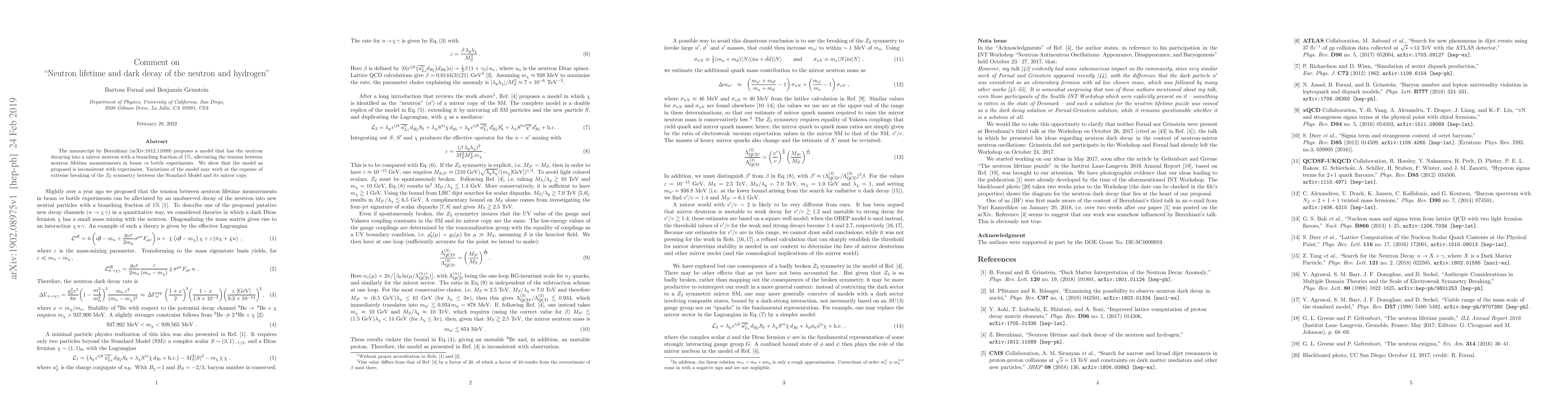 The manuscript by Berezhiani (arXiv:1812.11089) proposes a model that has the neutron decaying into a mirror neutron with a branching fraction of 1%, alleviating the tension between neutron lifetime measurements in beam vs bottle experiments. We show that the model as proposed is inconsistent with experiment. Variations of the model may work at the expense of extreme breaking of the $Z_2$ symmetry between the Standard Model and its mirror copy.