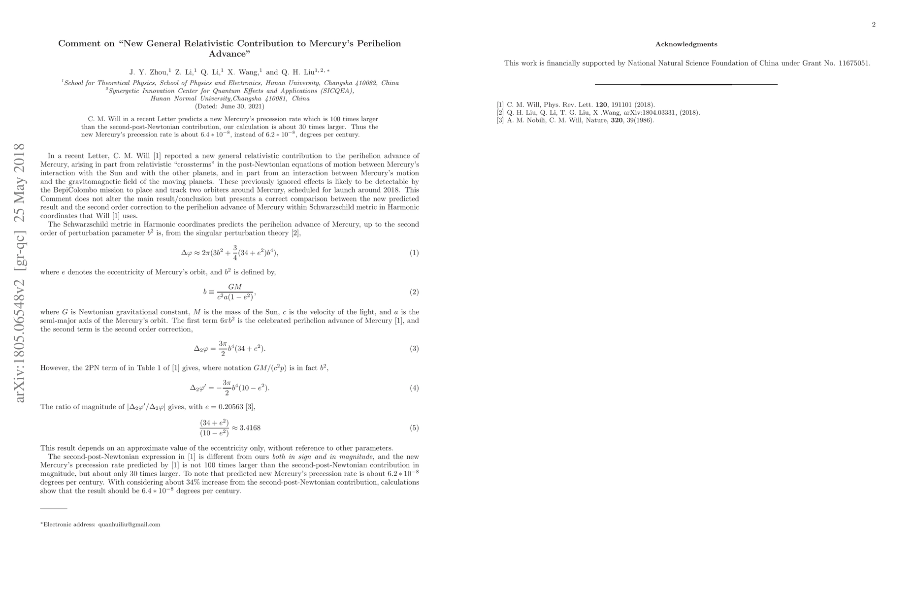 C. M. Will in a recent Letter [arXiv:1802.05304] predicts a new Mercury's precession rate which is $100$ times larger than the second-post-Newtonian contribution, our calculation is about $30$ times larger. Thus the new Mercury's precession rate is about $6.4\ast 10^{-8}$, instead of $6.2\ast 10^{-8}$, degrees per century.