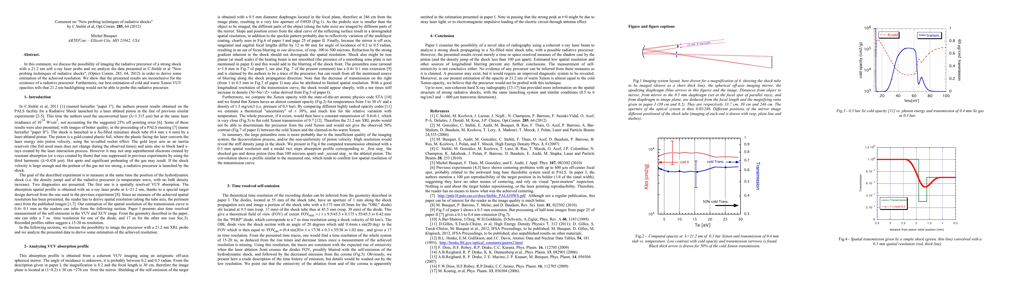 In this comment, we discuss the possibility of imaging the radiative precursor of a strong shock with a 21.2 nm soft x-ray laser probe and we analyze the data presented in C.Stehle et al "New probing techniques of radiative shocks", (Optics Communications 285, 64, 2012) in order to derive some estimation of the achieved resolution. We show that the presented results are inconclusive for the existence of a radiative precursor. Furthermore, our best estimation of cold and warm Xenon VUV opacities tells that 21.2 nm backlighting would not be able to probe this radiative precursor.